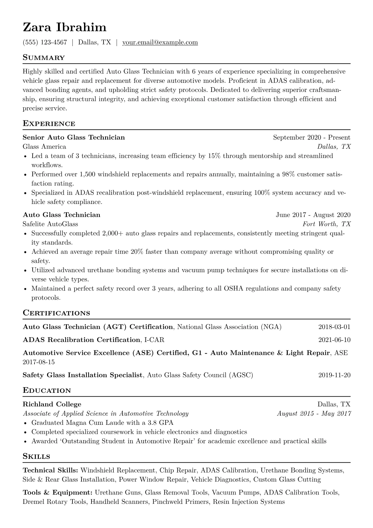 This template was built with JobSprout and can be remixed to create your own tailored Auto Glass Technician resume.