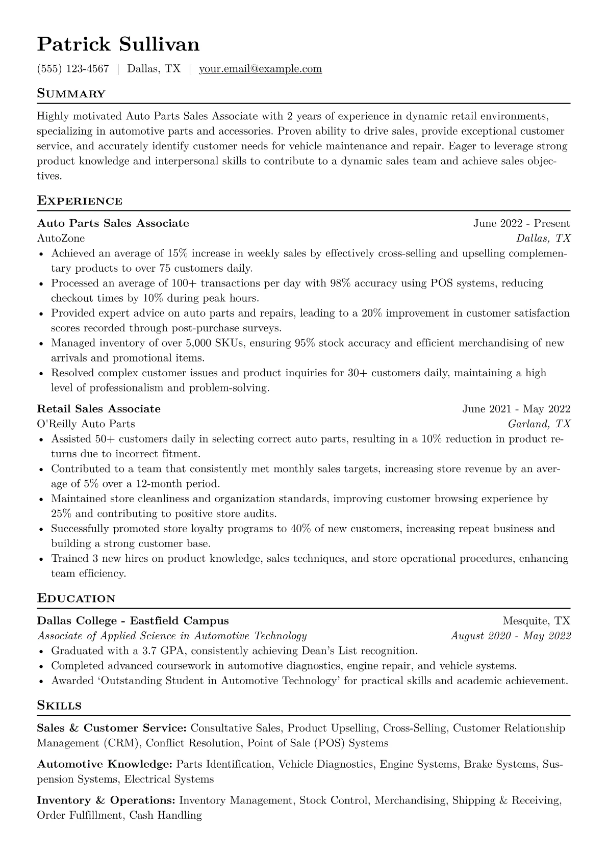 This template was built with JobSprout and can be remixed to create your own tailored Auto Parts Sales Associate resume.