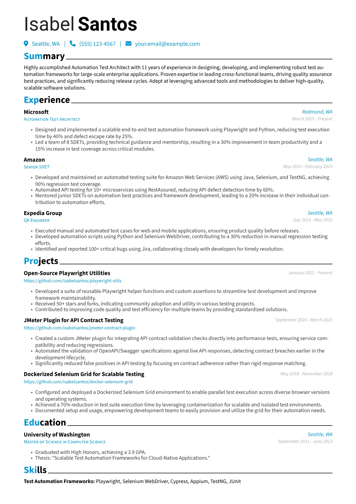 This example CV excels by immediately showcasing impactful contributions. Quantified achievements, such as "reduced regression cycle time by 40% through framework redesign," provide clear business value. Skills are intelligently grouped, separating "Test Frameworks & Tools" (e.g., Playwright, JMeter, Jenkins) from "Languages" (e.g., Python, Java) and "Cloud & DevOps" (e.g., AWS, Kubernetes), which helps recruiters quickly identify relevant expertise. Prominently featuring architect-level certifications further validates the candidate’s strategic capabilities.