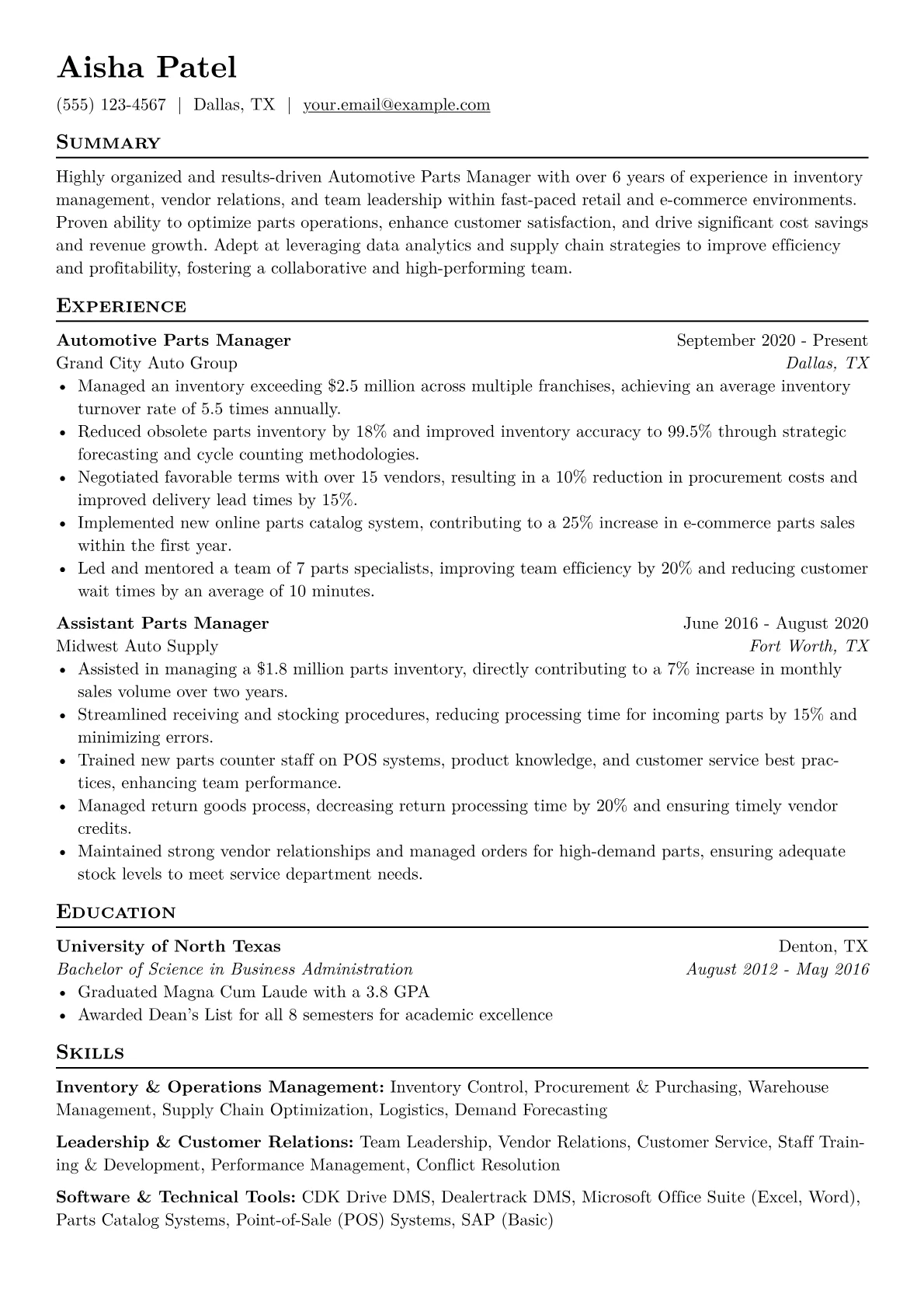 The featured resume example excels by strategically highlighting these exact areas. It quantifies achievements, such as "reduced obsolete inventory by 18%," providing clear evidence of impact. Skills are logically grouped into categories like "Inventory Optimization" and "E-commerce Logistics," making expertise immediately visible. Furthermore, the template prominently features relevant tools and certifications, specifically listing proficiency in major DMS platforms and an ASE P2 Parts Specialist certification, which are critical for this specialized role.