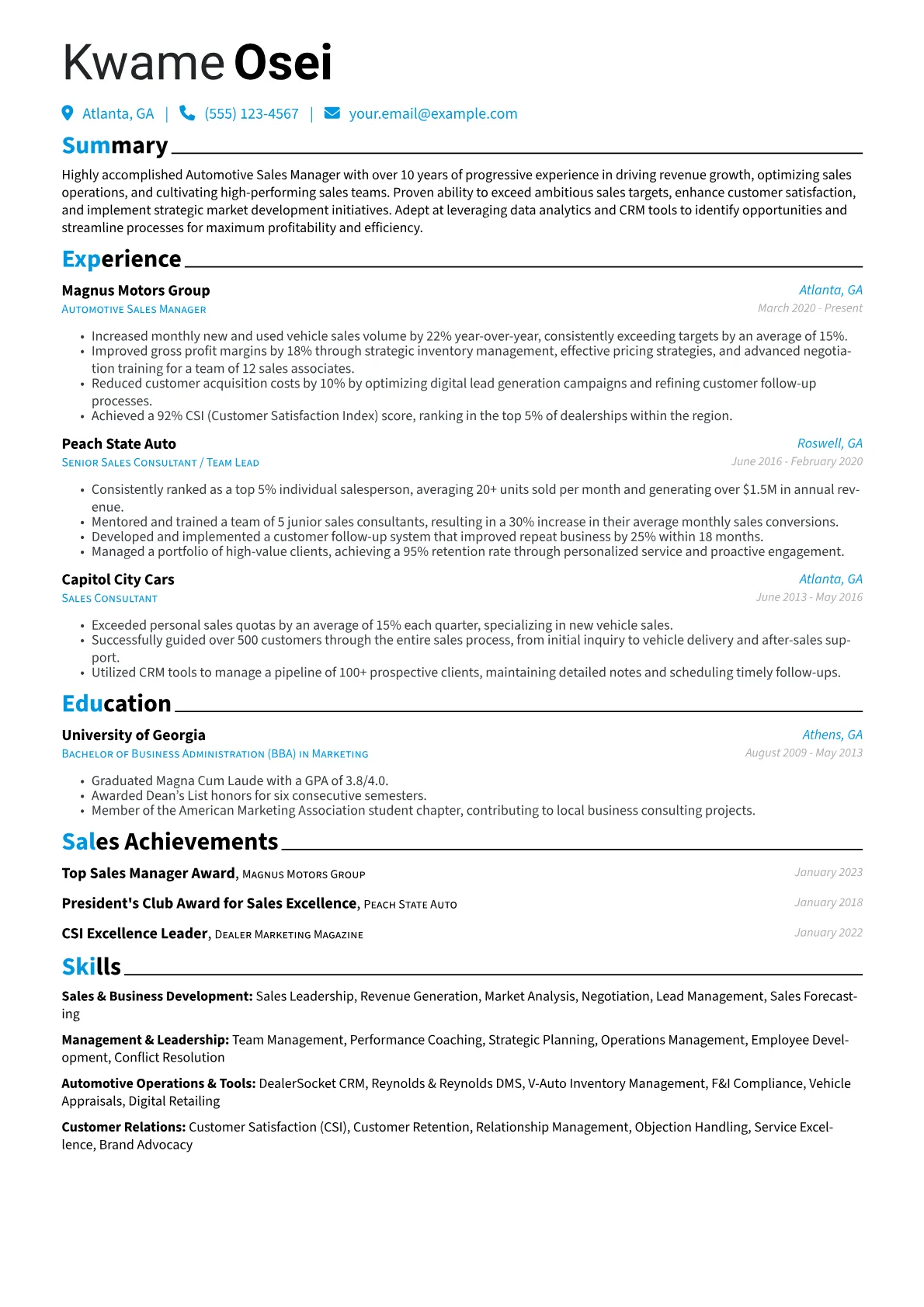 An exceptional Automotive Sales Manager resume in the "Other" industry must immediately showcase concrete leadership in driving sales volume and profitability. Hiring managers seek evidence of increasing market share, optimizing F&I product penetration, and improving inventory turnover rates. Crucially, a strong resume will highlight experience with manufacturer incentive programs, proficiency in CRM platforms like DealerTrack or Reynolds and Reynolds, and a history of elevating Customer Satisfaction Index (CSI) scores. Specific achievements detailing percentages of growth or direct dollar impact are essential, alongside any relevant certifications in sales leadership or specific automotive software.