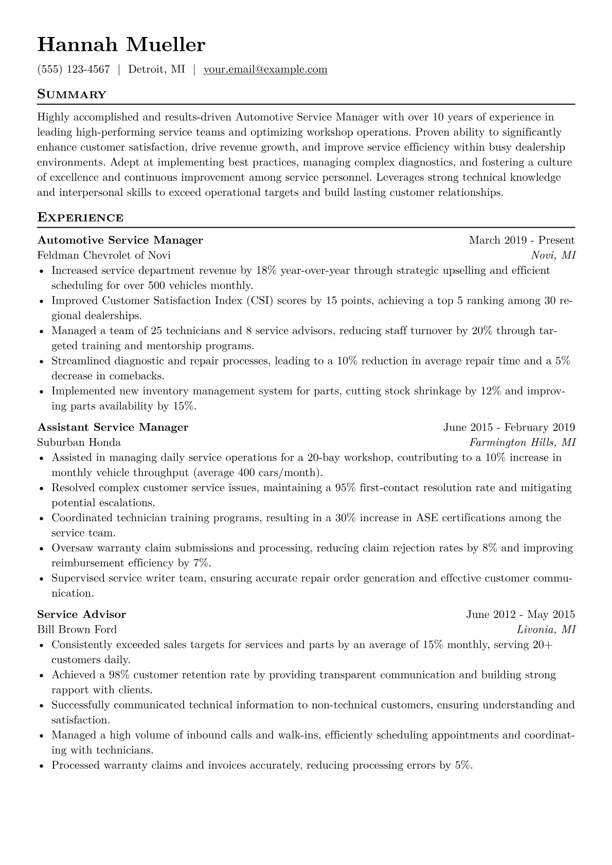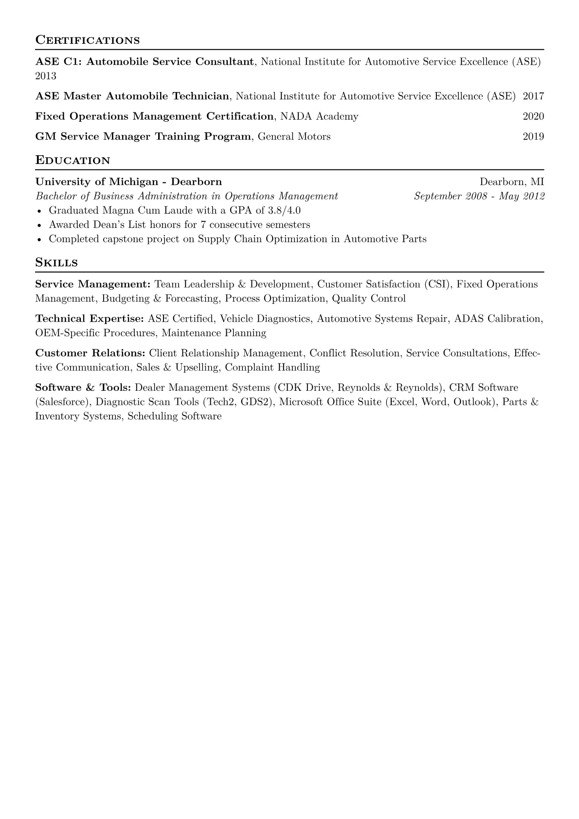For an Automotive Service Manager in Manufacturing, hiring managers prioritize candidates who blend technical expertise with a keen eye for operational efficiency and quality control. Successful resumes highlight achievements in reducing warranty claims, optimizing service turnaround times, and implementing lean methodologies within service operations. Specific certifications like ASE Master Technician, Six Sigma, or OEM-specific training are crucial, alongside experience with diagnostic protocols, parts logistics, and KPI management such as first-time fix rates or mean time to repair. The ability to bridge manufacturing quality standards with customer service expectations is paramount.