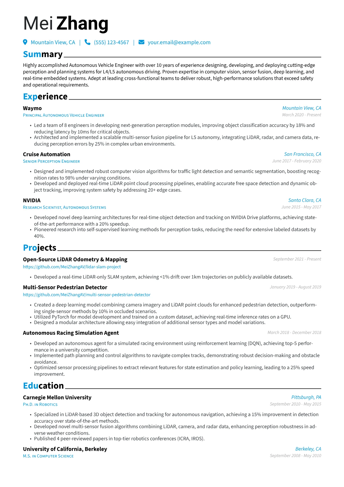 This template was built with JobSprout and can be remixed to create your own tailored Autonomous Vehicle Engineer resume. It provides a robust framework to showcase your advanced technical capabilities and project leadership.