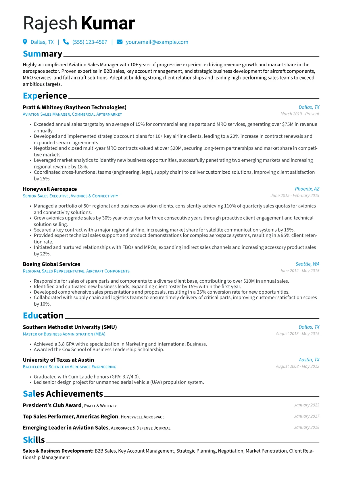 This template was built with JobSprout and offers a robust framework, easily remixed to create your own tailored Aviation Sales Manager resume that targets specific career aspirations.