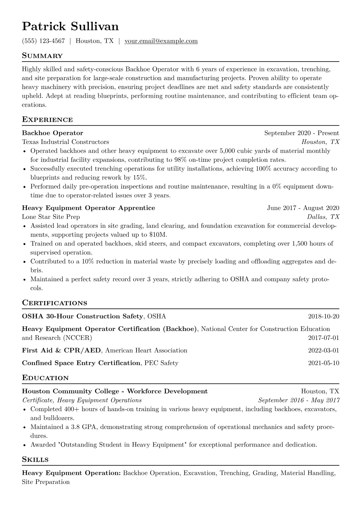 This template was built with JobSprout and can be remixed to create your own tailored Backhoe Operator resume.