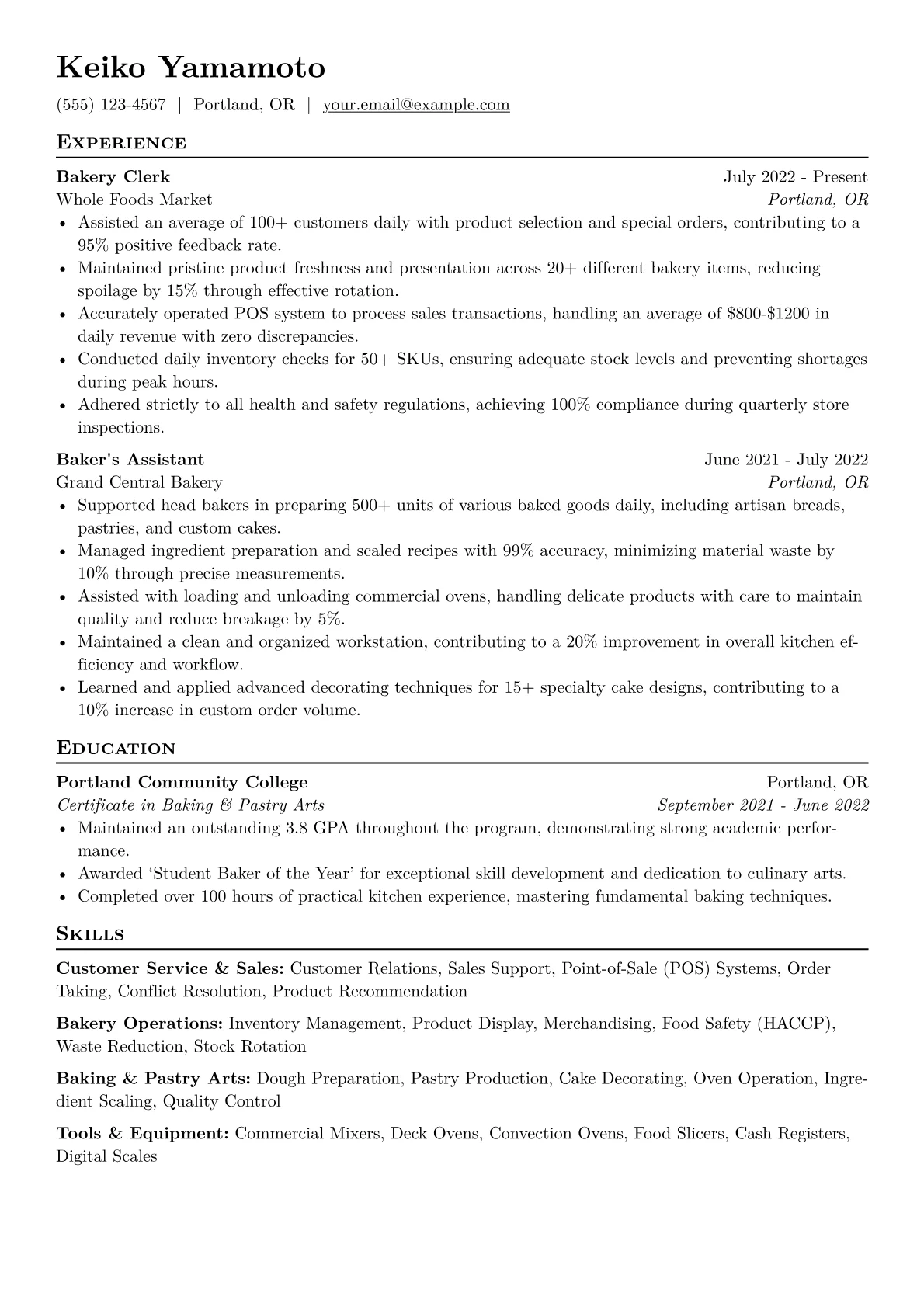 For an entry-level Bakery Clerk, a strong resume showcases excellent customer service, basic food handling knowledge, and a keen eye for presentation. Hiring managers in Retail & E-commerce seek candidates who are reliable, detail-oriented, and capable of working in a fast-paced environment with varied hours, often involving early mornings. The unique challenges include product freshness, inventory management, and handling customer inquiries about ingredients.