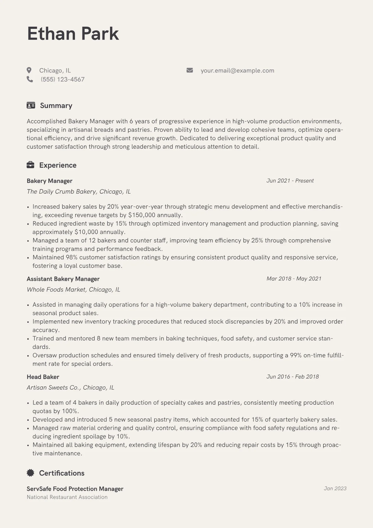 This example resume effectively showcases these vital attributes. It quantifies achievements clearly, for instance, detailing how a manager "reduced ingredient waste by 15% through optimized purchasing" or "increased daily pastry output by 10% by streamlining production lines." Skills are grouped logically under headings such as "Operational Leadership," "Team Management," and "Food Safety Compliance," making the candidate's expertise immediately apparent. Critical certifications and relevant software proficiencies are prominently featured, providing a comprehensive overview of capabilities.