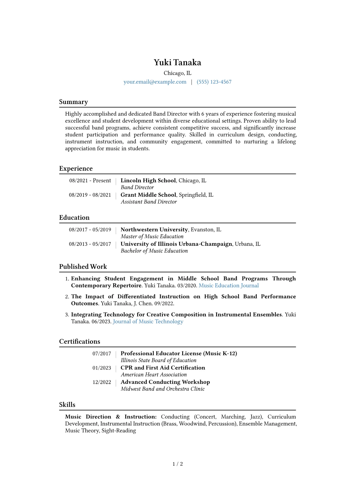 This robust template was thoughtfully constructed using JobSprout. Job seekers can easily adapt it to build their own compelling Band Director resume.