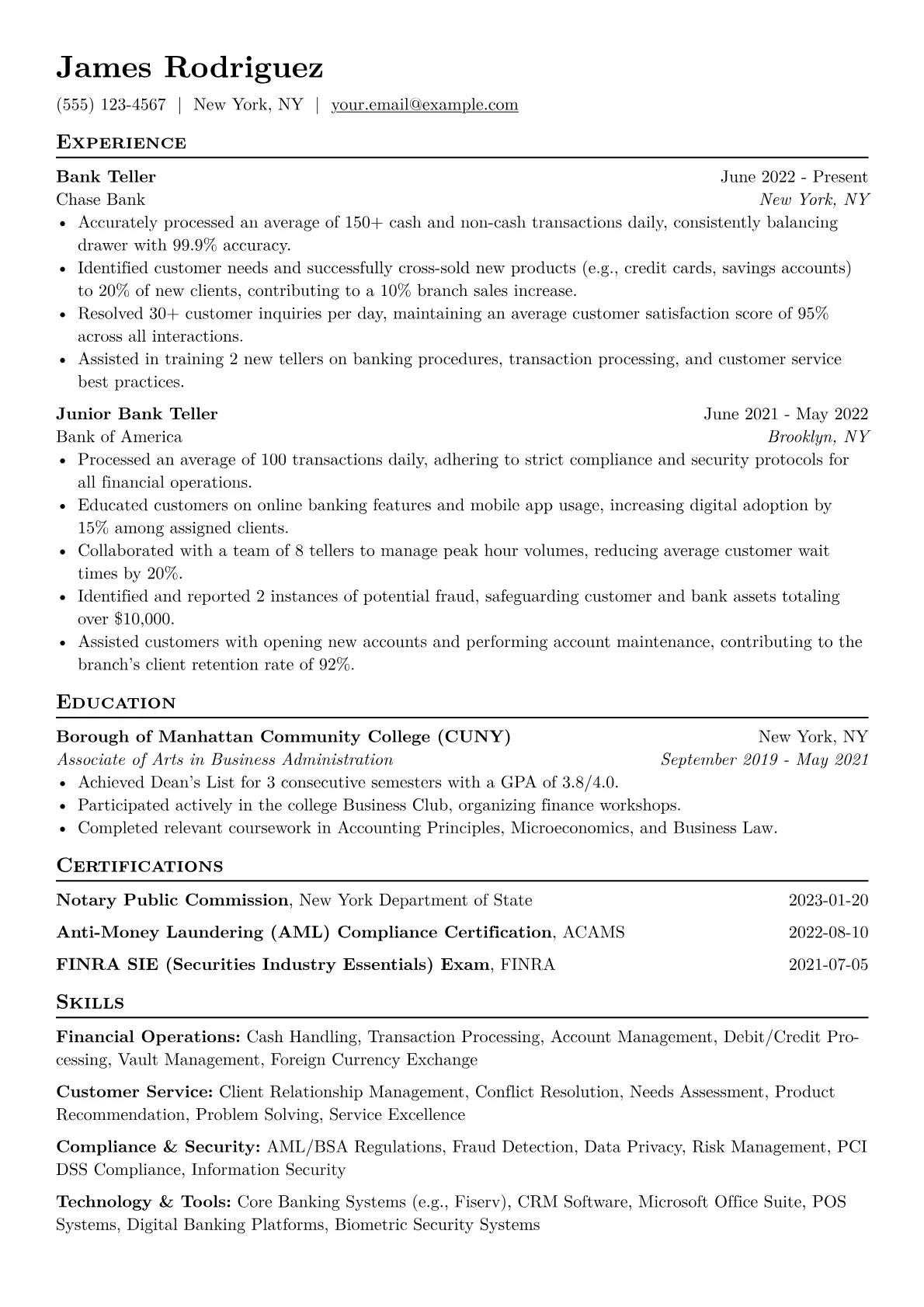 This JobSprout example effectively highlights key Bank Teller competencies. It features quantified achievements such as daily transaction volumes and accuracy rates, providing concrete evidence of capability. The resume also intelligently groups essential skills like "Cash Handling & Reconciliation," "Customer Service Excellence," and "Compliance Adherence," making it easy for recruiters to identify relevant expertise.