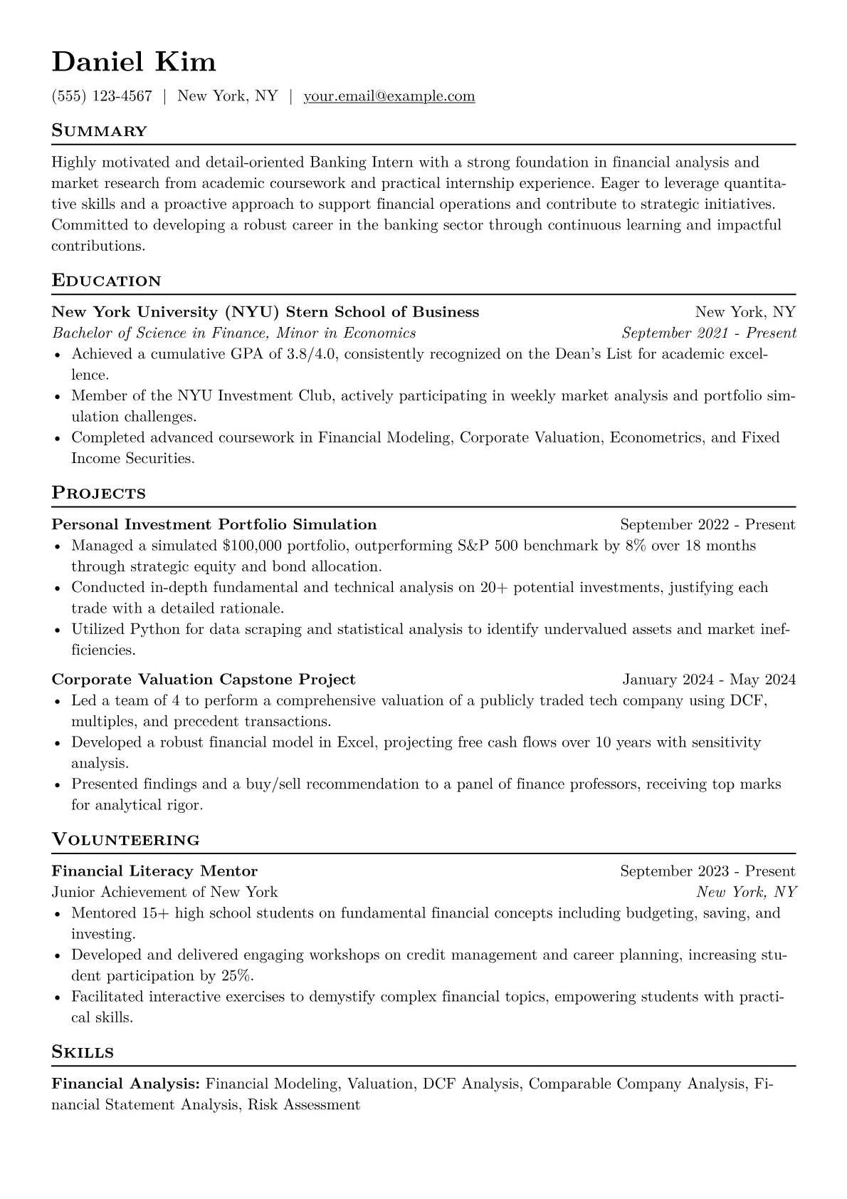 The JobSprout Banking Intern example excels at highlighting these crucial elements. It effectively quantifies achievements, such as assisting in analyzing "20+ client portfolios" or contributing to projects that "reduced processing time by 15%," giving a clear sense of impact. Skills are logically grouped under headings like "Financial Analysis," "Data Management," and "Compliance," making it easy for recruiters to identify core competencies. Furthermore, the template prominently features proficiency with critical tools like Bloomberg Terminal, FactSet, and Python, alongside relevant coursework, positioning the intern as a technically capable and well-prepared candidate.