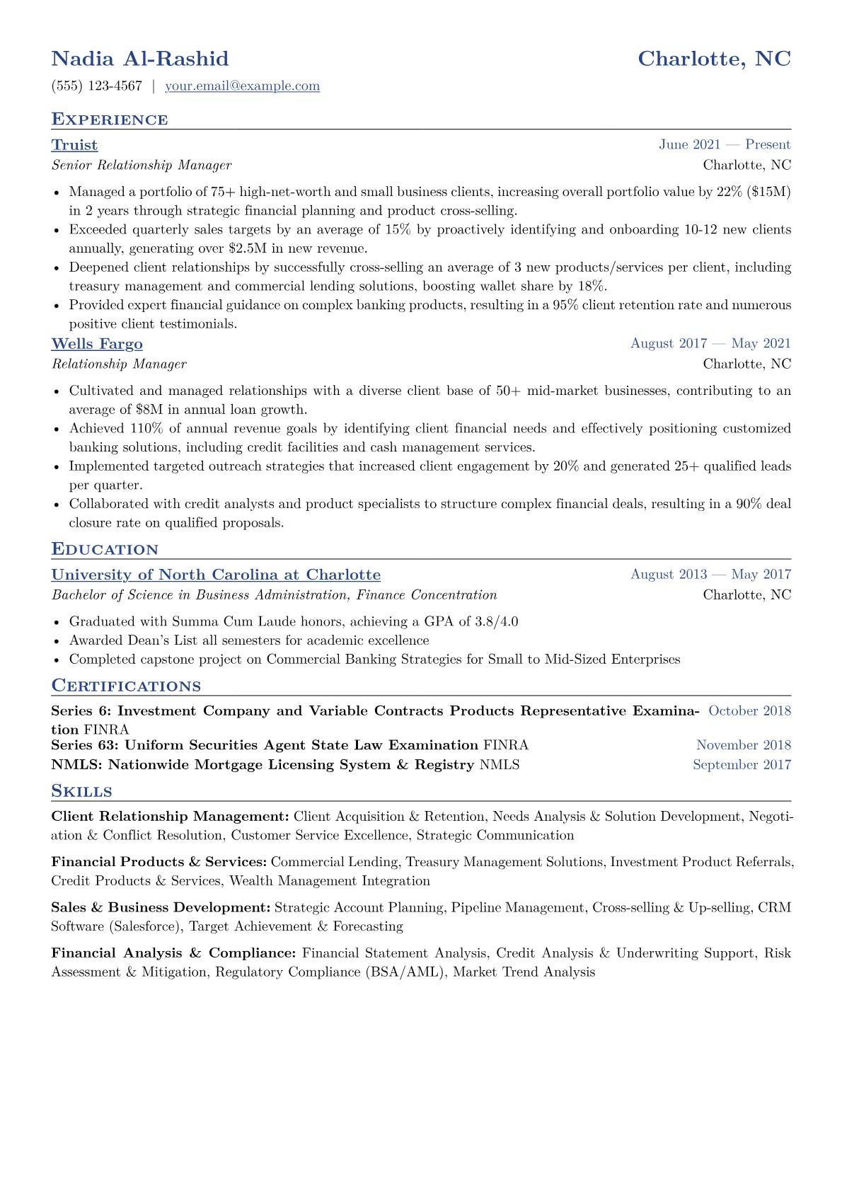 This example excels by prioritizing quantified achievements, immediately highlighting revenue generated, portfolio growth, and successful client acquisition rates. The resume effectively groups relevant skills and certifications, like FINRA licenses or specific financial software proficiency, making it easy for recruiters to identify key competencies at a glance. Its clear structure emphasizes the candidate's business development focus.