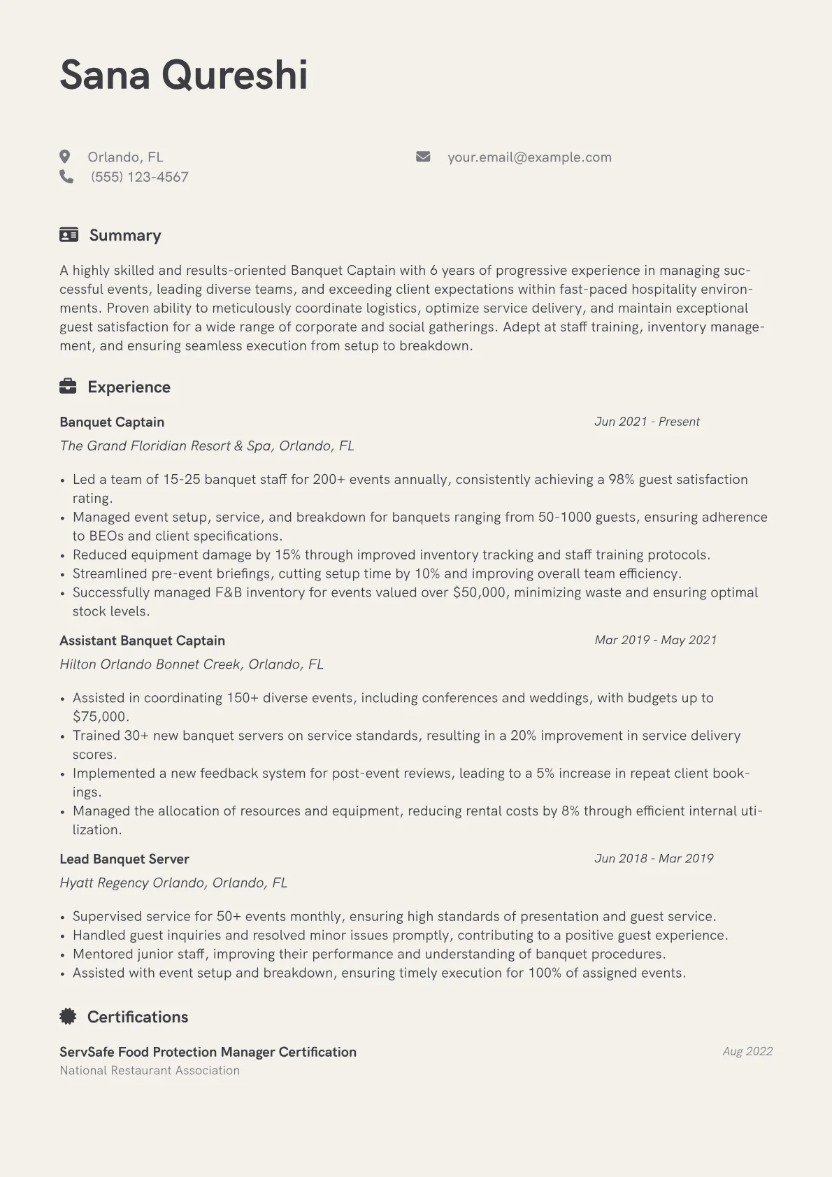 This template was built with JobSprout and can be remixed to create your own tailored Banquet Captain resume, ensuring your qualifications stand out.