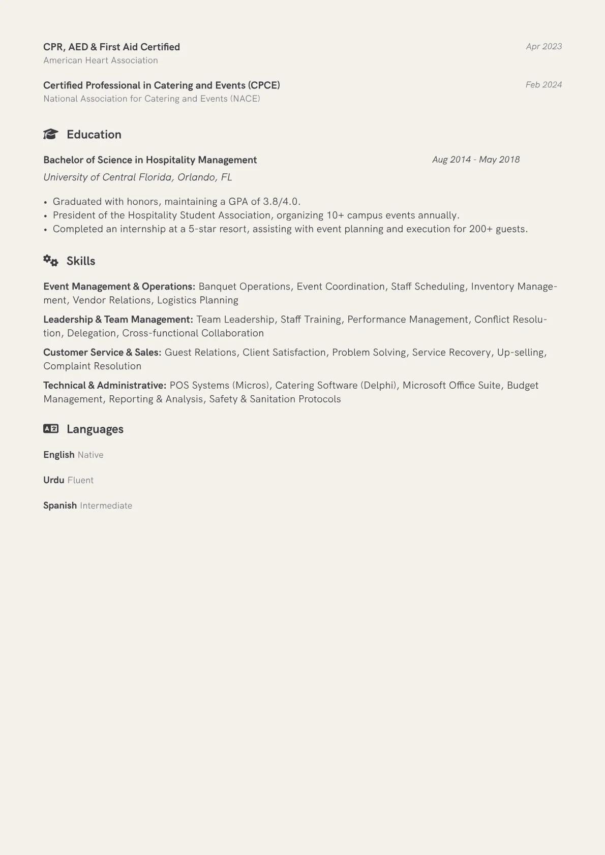 A strong Banquet Captain resume, particularly for a mid-level professional in the broader event and hospitality sector, must demonstrate robust operational leadership. Hiring managers prioritize candidates who can effectively manage diverse teams, execute intricate banquet event orders (BEOs) flawlessly, and maintain exceptional guest satisfaction under pressure. Key achievements should quantify improvements in service efficiency, reductions in operational costs, or increases in client retention. Mentioning familiarity with common POS systems, inventory management software, and any relevant certifications like TIPS for alcohol service or basic food hygiene is crucial for signaling job readiness.