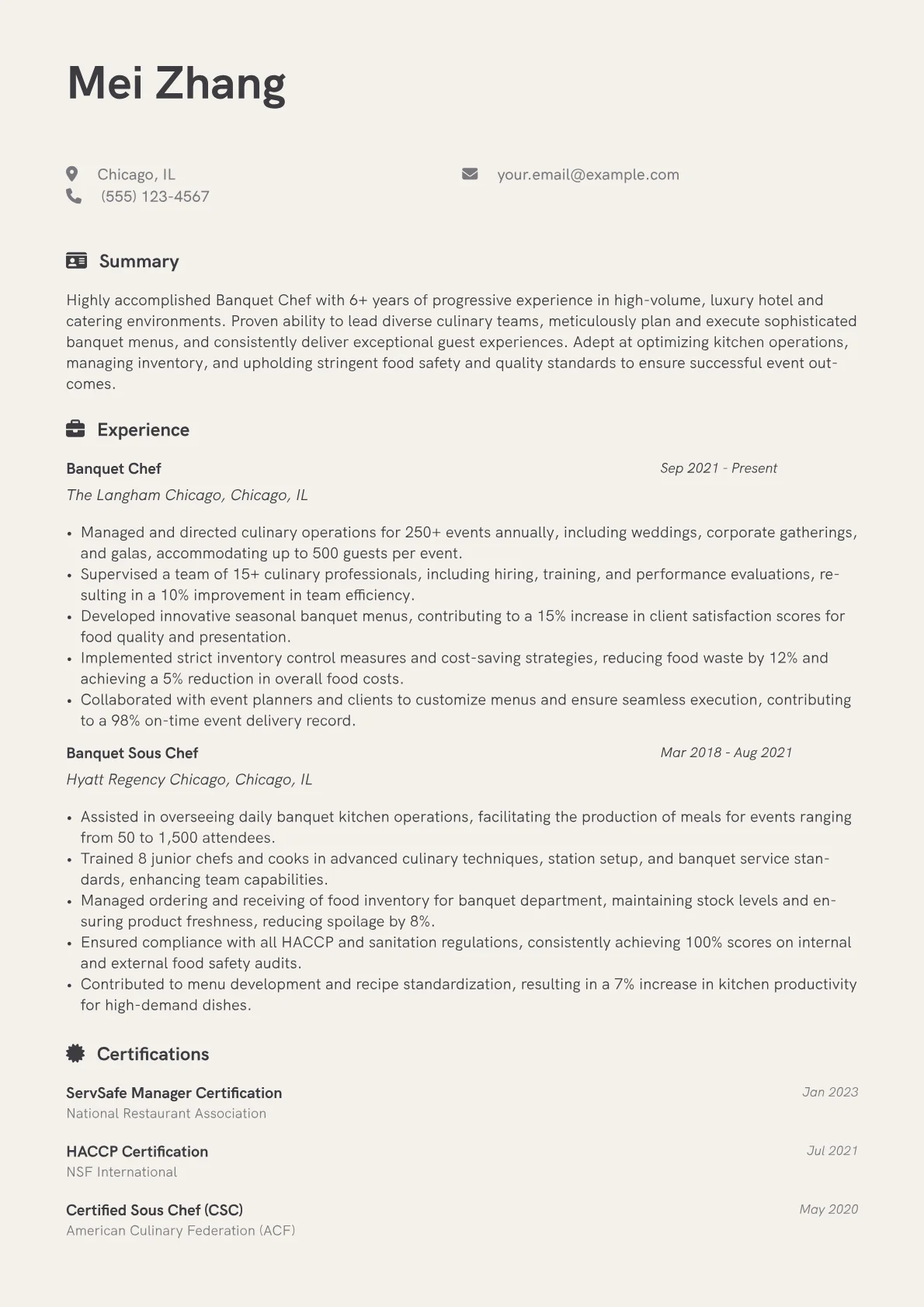 This template was built with JobSprout and can be remixed to create your own tailored Banquet Chef resume. Start crafting your professional profile today.