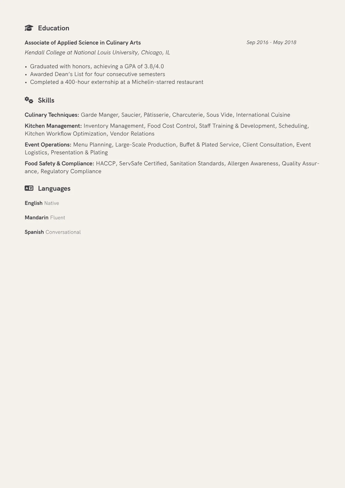 This example CV excels by featuring specific, quantified achievements, such as reducing food waste by 15% and successfully catering events for up to 500 guests. Skills are effectively grouped into categories like "Culinary Arts," "Kitchen Management," and "Team Leadership," clearly communicating a broad operational skillset. Certifications, including ServSafe Manager, are prominently highlighted, assuring employers of compliance and safety expertise. The resume specifically details experience across various event types, showcasing adaptability vital for a Banquet Chef in dynamic environments.