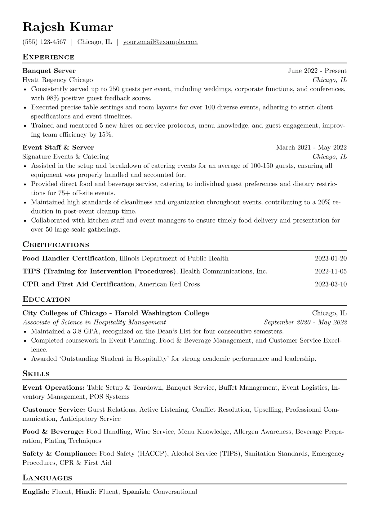 A strong Banquet Server resume for the event and hospitality sector emphasizes exceptional service, efficiency, and adaptability. Hiring managers in diverse venues prioritize candidates who demonstrate strong communication, the ability to manage time-sensitive event flows, and a proactive approach to guest satisfaction, often navigating varied event requirements and tight schedules.