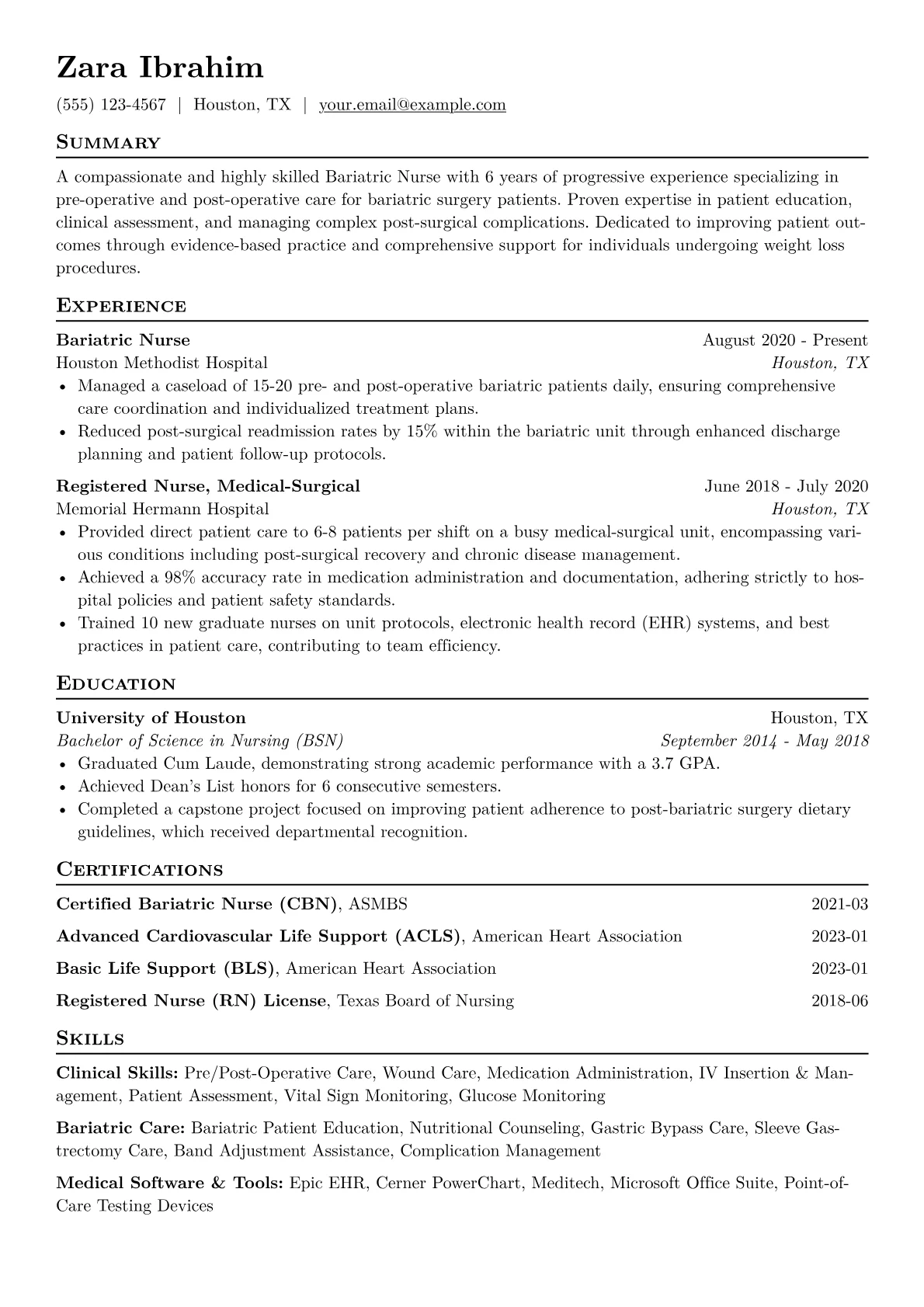 This template was built with JobSprout and can be remixed to create your own tailored Bariatric Nurse resume.