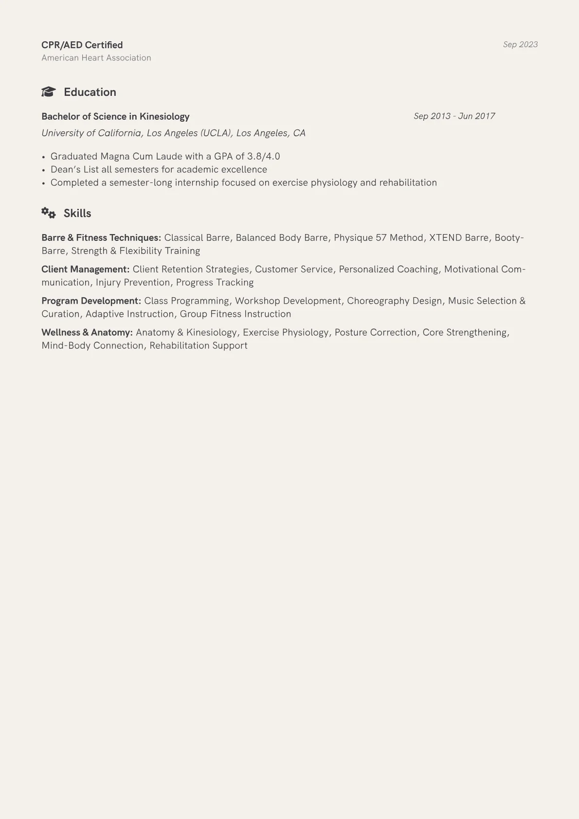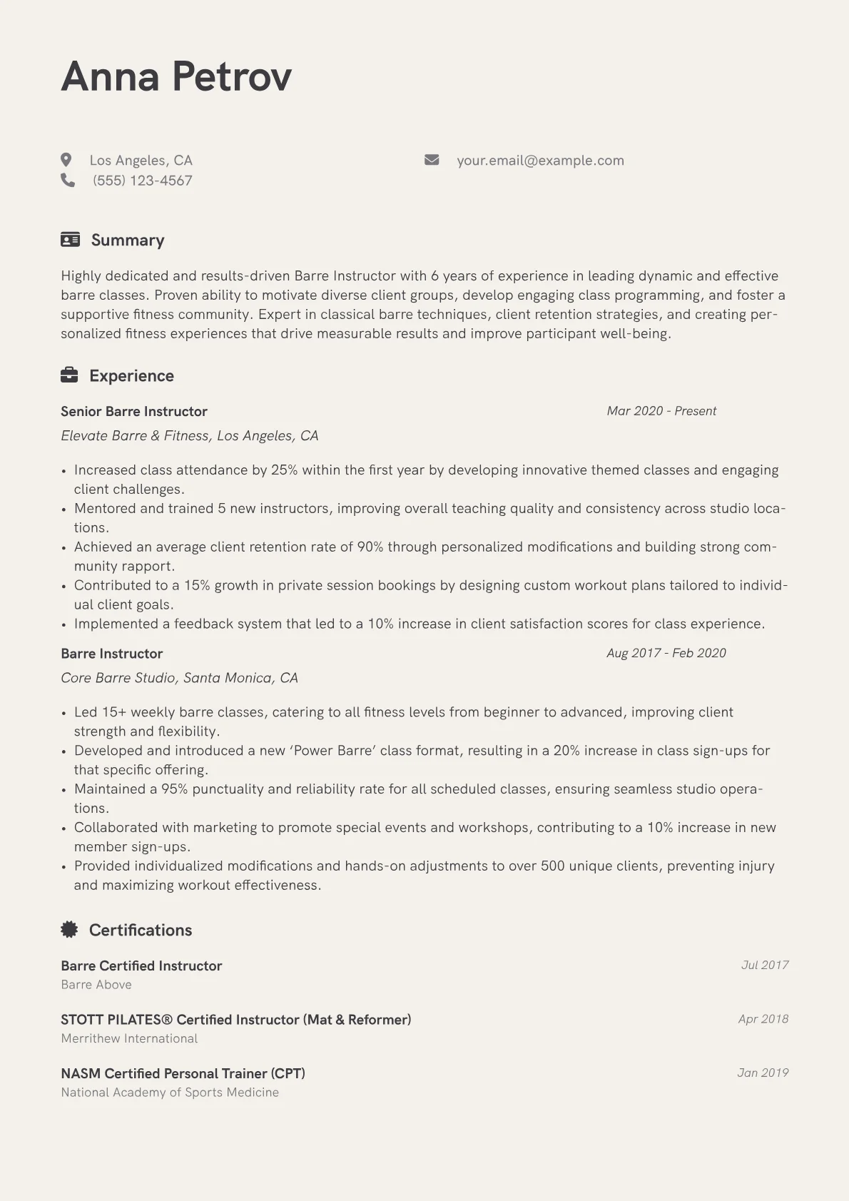 This template was built with JobSprout and can be remixed to create your own tailored Barre Instructor resume.
