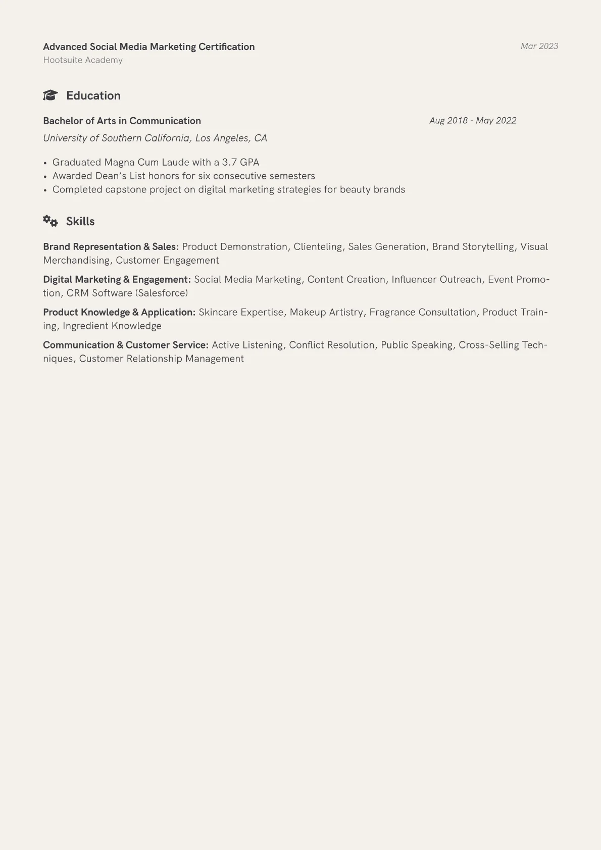 This example CV effectively showcases these crucial elements. It quantifies achievements by detailing metrics like "increased Instagram engagement by 20% through targeted content" or "conducted 3 successful product workshops weekly." Skills are strategically grouped, separating "Product Knowledge" (e.g., specific brand lines) from "Digital Engagement" (e.g., content creation, community management), making the candidate's capabilities clear. Additionally, certifications like "Certified Makeup Artist" and proficiency with tools such as Canva or TikTok are prominently featured, immediately communicating readiness for the role's demands.