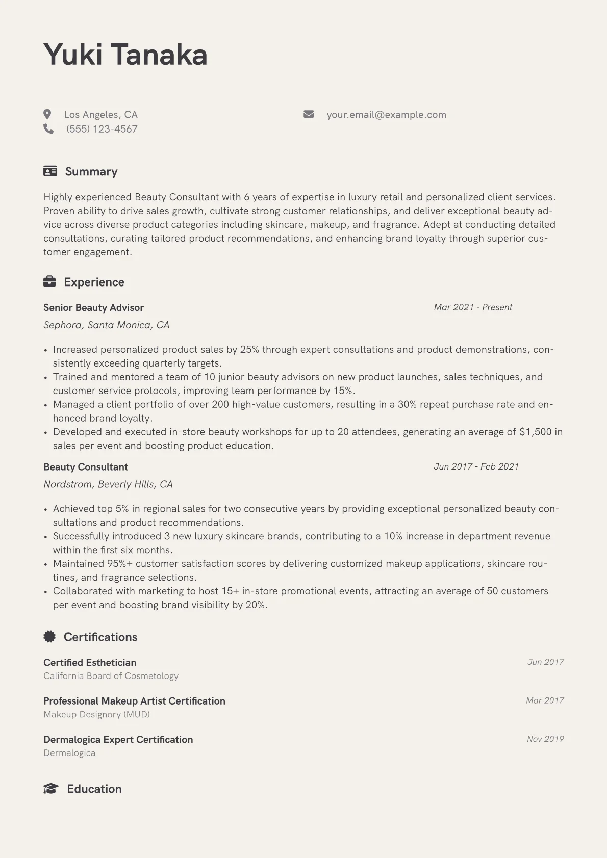 This template was built with JobSprout and can be remixed to create your own tailored Beauty Consultant resume.