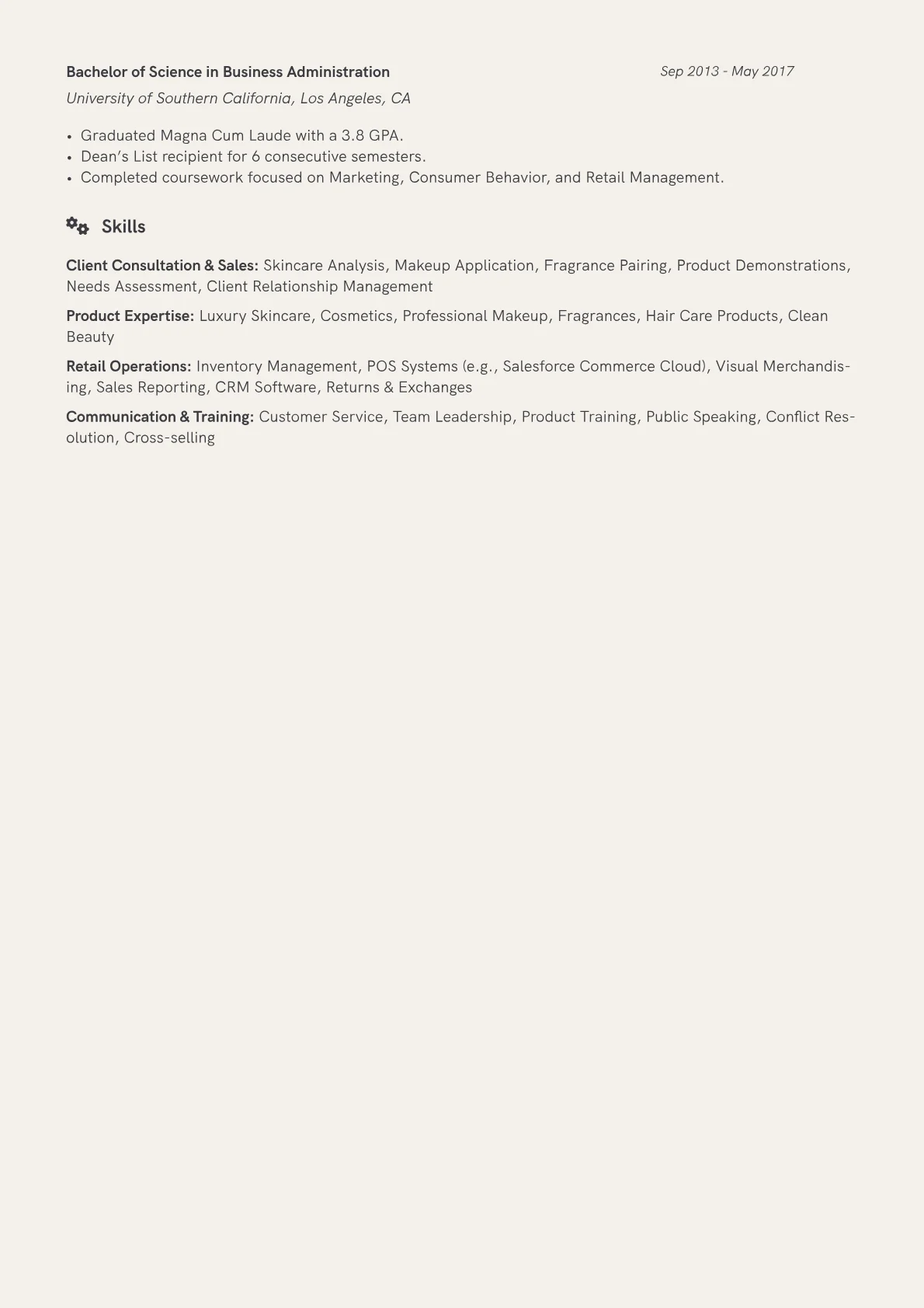 This example resume excels by quantifying achievements directly relevant to a Beauty Consultant. Instead of general duties, it details metrics like "increased average service booking by 15% through tailored recommendations" or "managed a client portfolio of 200+ individuals, ensuring personalized follow-up." Skills are logically grouped, distinguishing between "Technical Expertise" (e.g., CRM platforms, POS systems) and "Client Engagement" (e.g., consultation, upselling, product demonstration). Crucially, relevant certifications and specialized brand training are prominently featured, immediately communicating a focused and up-to-date skillset.