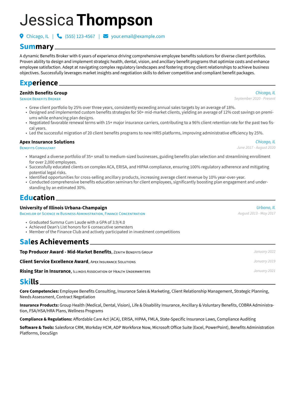 This example CV excels at structuring a candidate's value proposition. It quantifies achievements by detailing metrics like "expanded client portfolio by 25%" or "achieved 110% of annual sales quota," providing tangible evidence of impact. Skills are logically grouped into categories such as "Client Relationship Management," "Benefit Program Design," and "Compliance & Market Analysis," offering a clear overview. Key tools like CRM platforms and benefits administration software are highlighted, alongside critical state insurance licenses, assuring immediate operational capability.