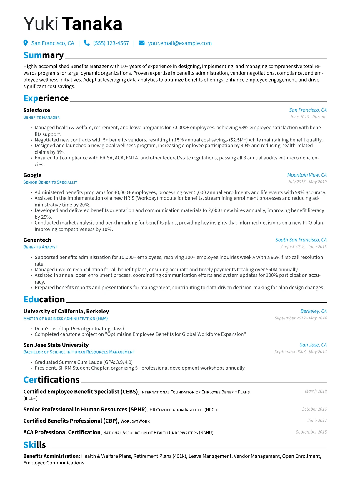 This template was built with JobSprout and can be remixed to create your own tailored Benefits Manager resume, ensuring your qualifications stand out.