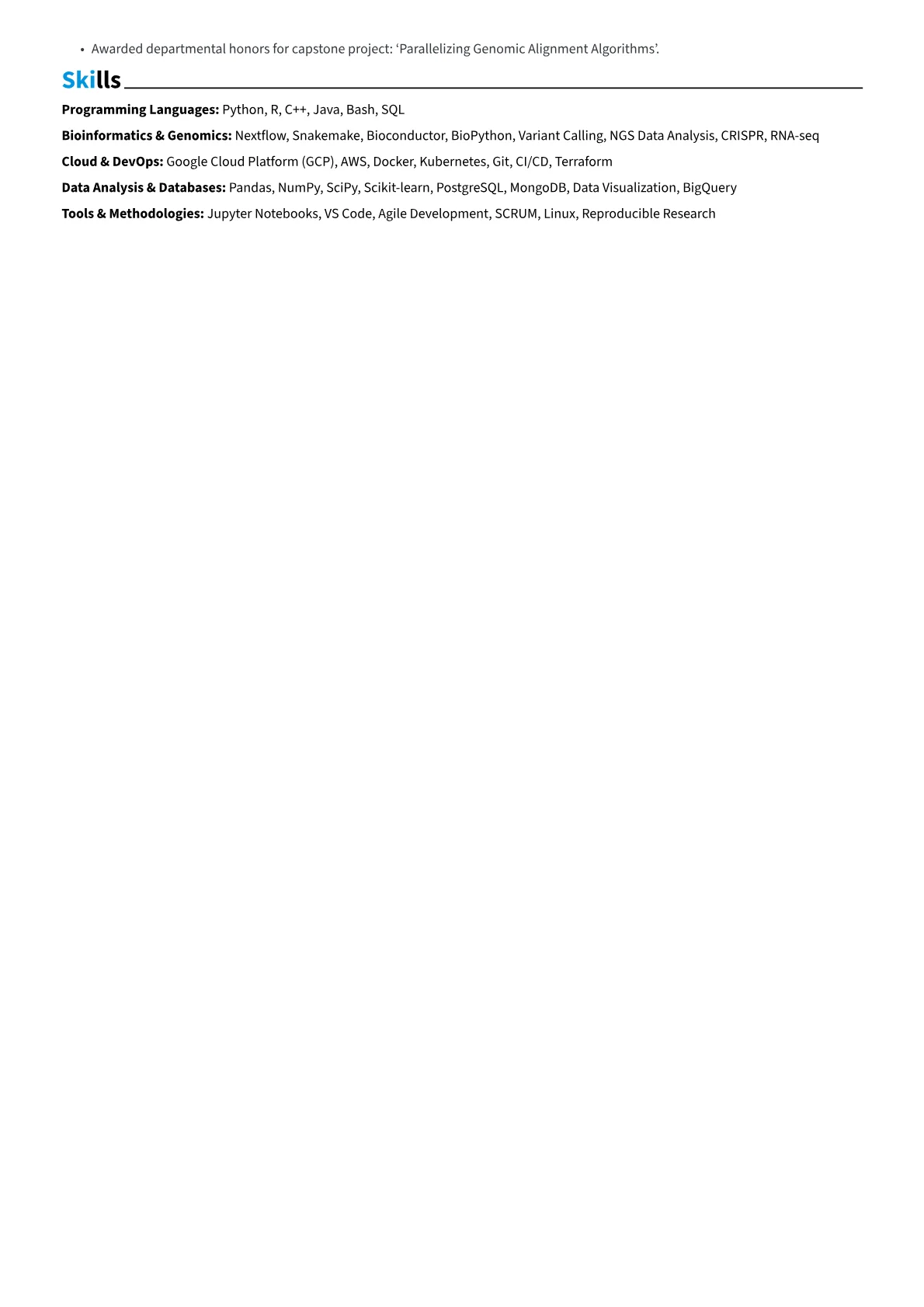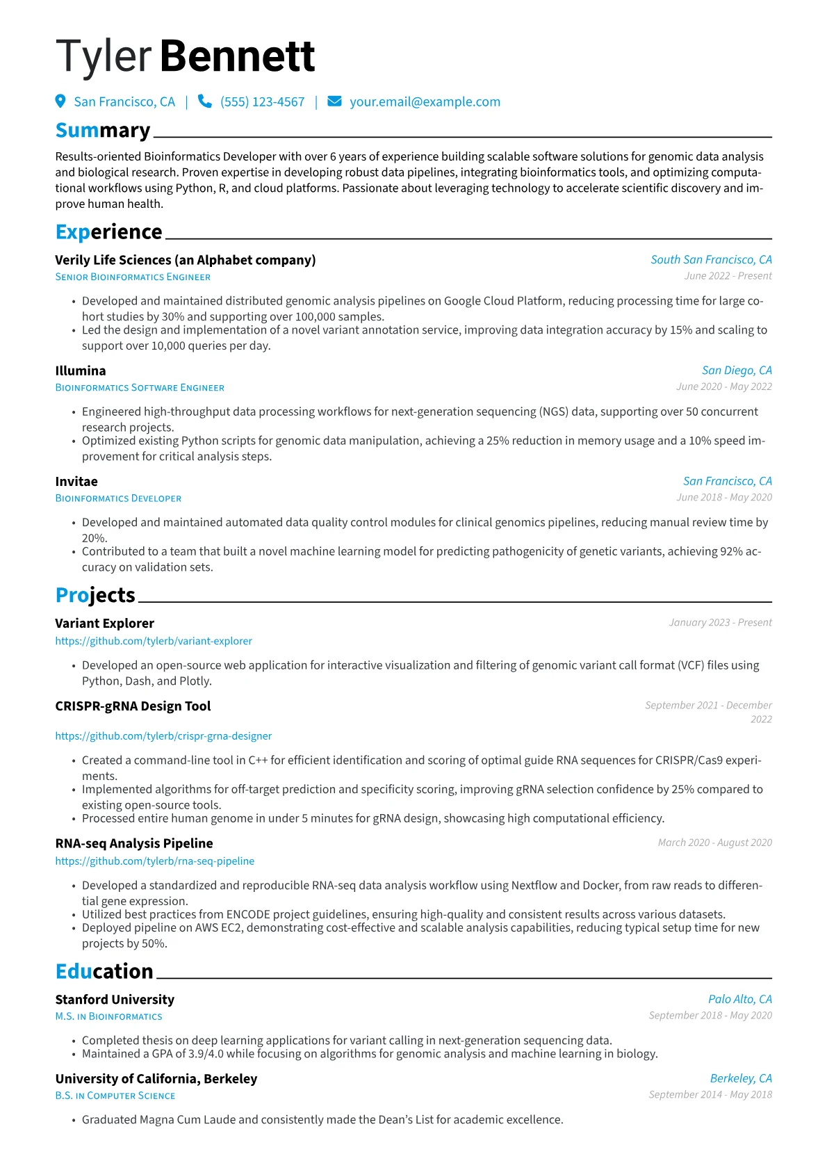 This template was built with JobSprout and can be remixed to create your own tailored Bioinformatics Developer resume. It provides an excellent framework for presenting your specialized skills and achievements effectively.