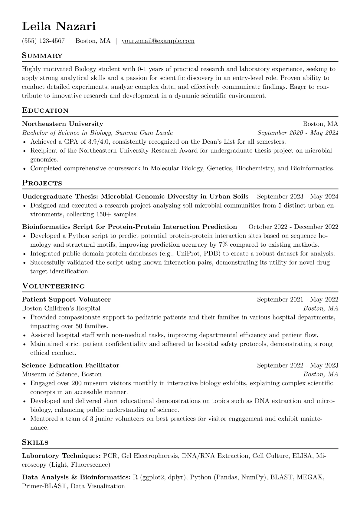 For biology students targeting roles in diverse scientific fields, a resume must highlight tangible research experience and technical proficiencies. Hiring managers seek evidence of practical lab skills, understanding of experimental design, and data interpretation abilities. Crucial elements include specific laboratory techniques like PCR, microscopy, or cell culture, alongside familiarity with statistical software or bioinformatics tools. Quantified achievements, such as successful project completion, contributions to research findings, or presenting poster sessions, demonstrate concrete impact and scientific rigor beyond coursework. Biosafety certifications and knowledge of GLP standards are also highly valued.