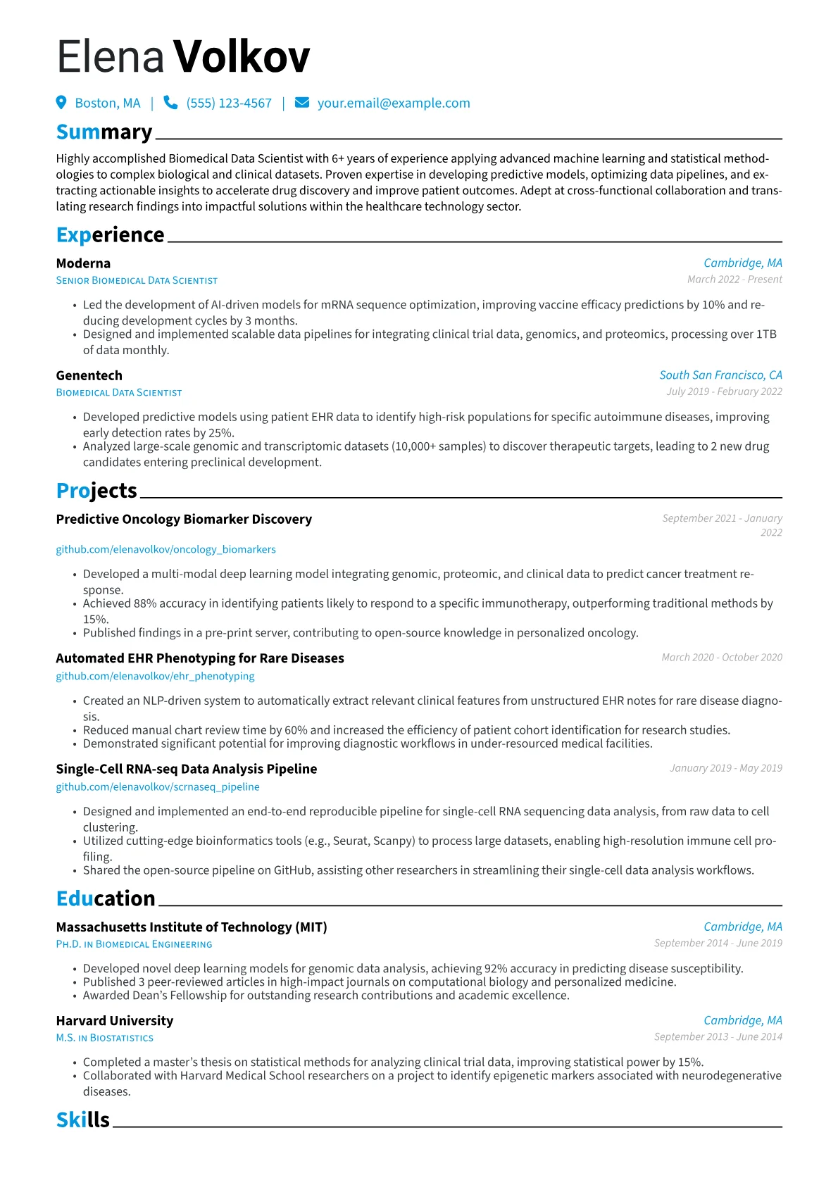This template was built with JobSprout and can be remixed to create your own tailored Biomedical Data Scientist resume. It provides a robust framework to highlight your unique blend of scientific and technical expertise.