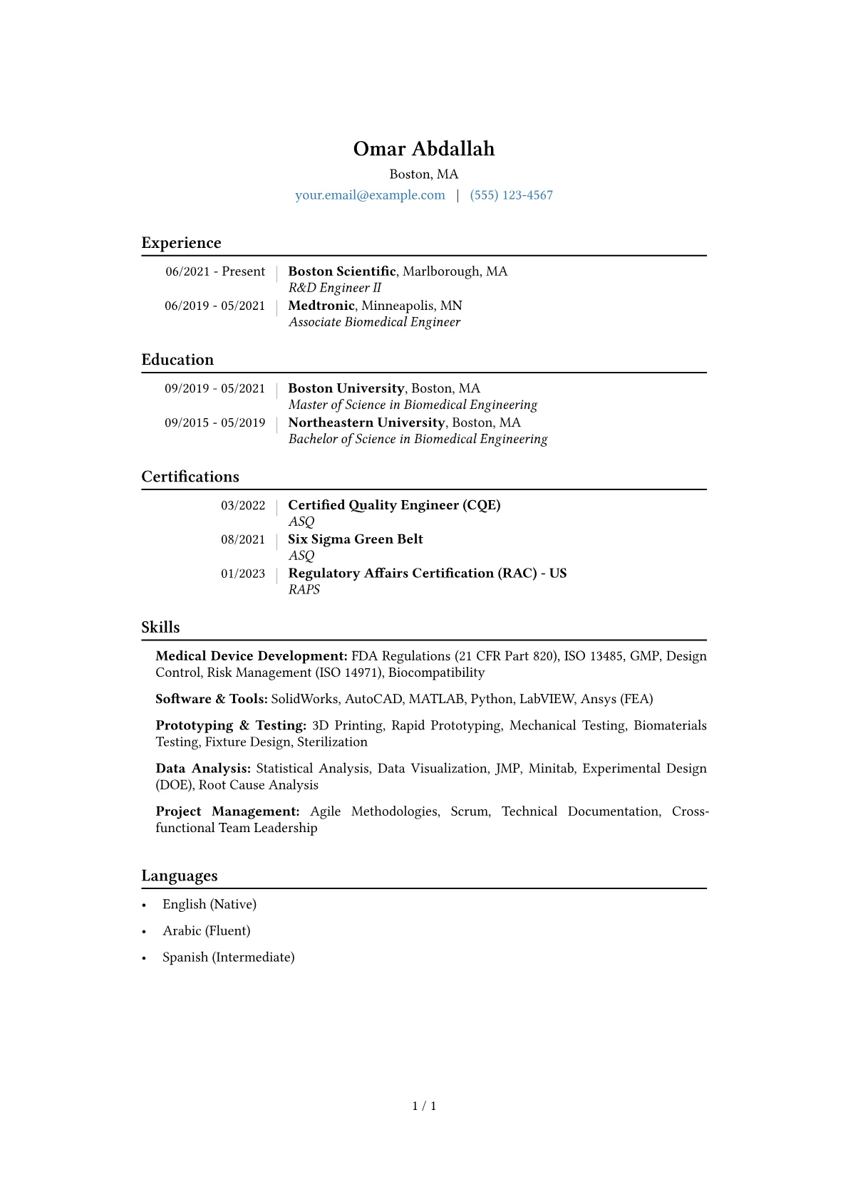 This robust template was built with JobSprout and can be easily remixed to create your own compelling Biomedical Engineer resume.