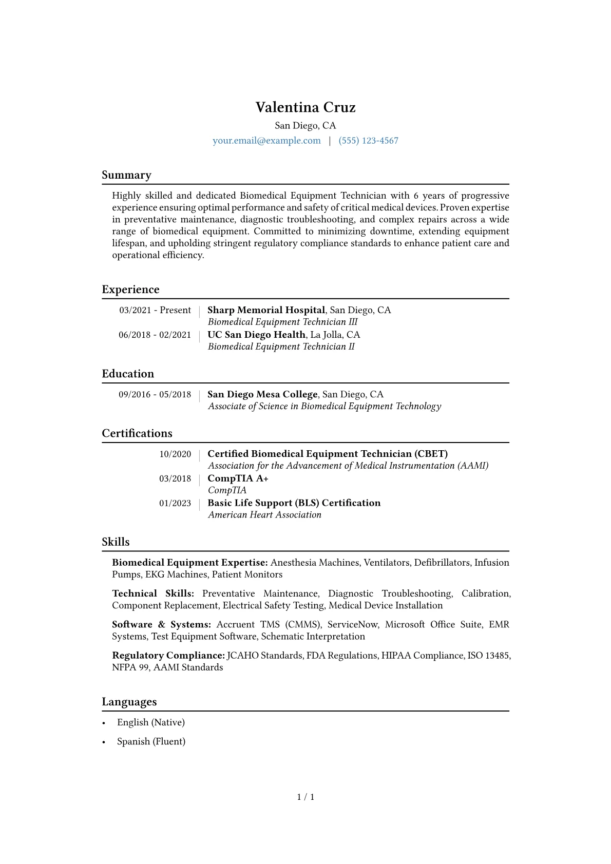 For a mid-level Biomedical Equipment Technician in healthcare, hiring managers prioritize resumes that concretely demonstrate impact on patient care, operational efficiency, and regulatory adherence. Employers seek achievements detailing improvements in equipment uptime for critical devices, reductions in repair turnaround times, or proactive management of preventive maintenance schedules. Certifications like CBET or CRES are highly valued, as is experience with specific CMMS platforms such as Accruent and modalities ranging from patient monitoring systems to surgical robotics or diagnostic imaging. Precise documentation and adherence to AAMI standards are essential.