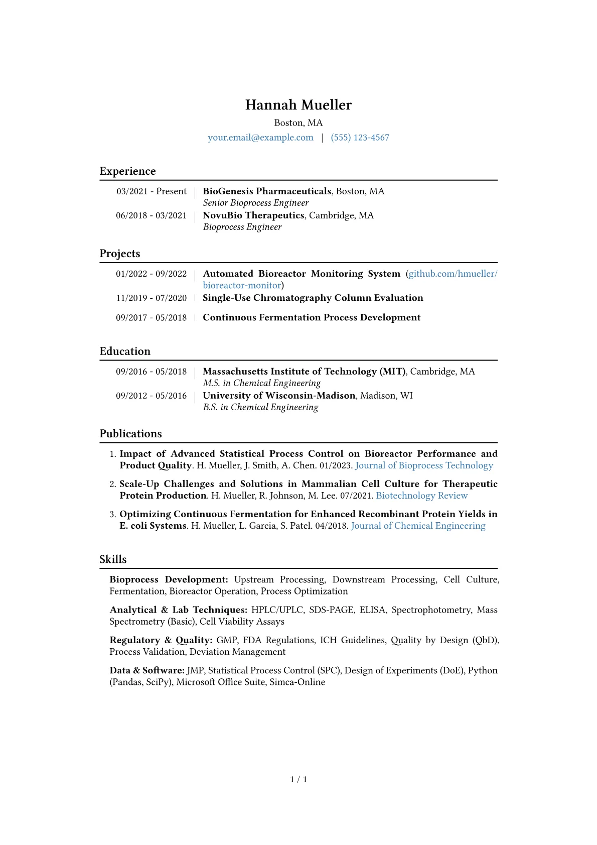 This impressive template was built using JobSprout's professional CV builder, offering a clear and customizable framework. You can remix this example to create your own compelling Bioprocess Engineer resume.