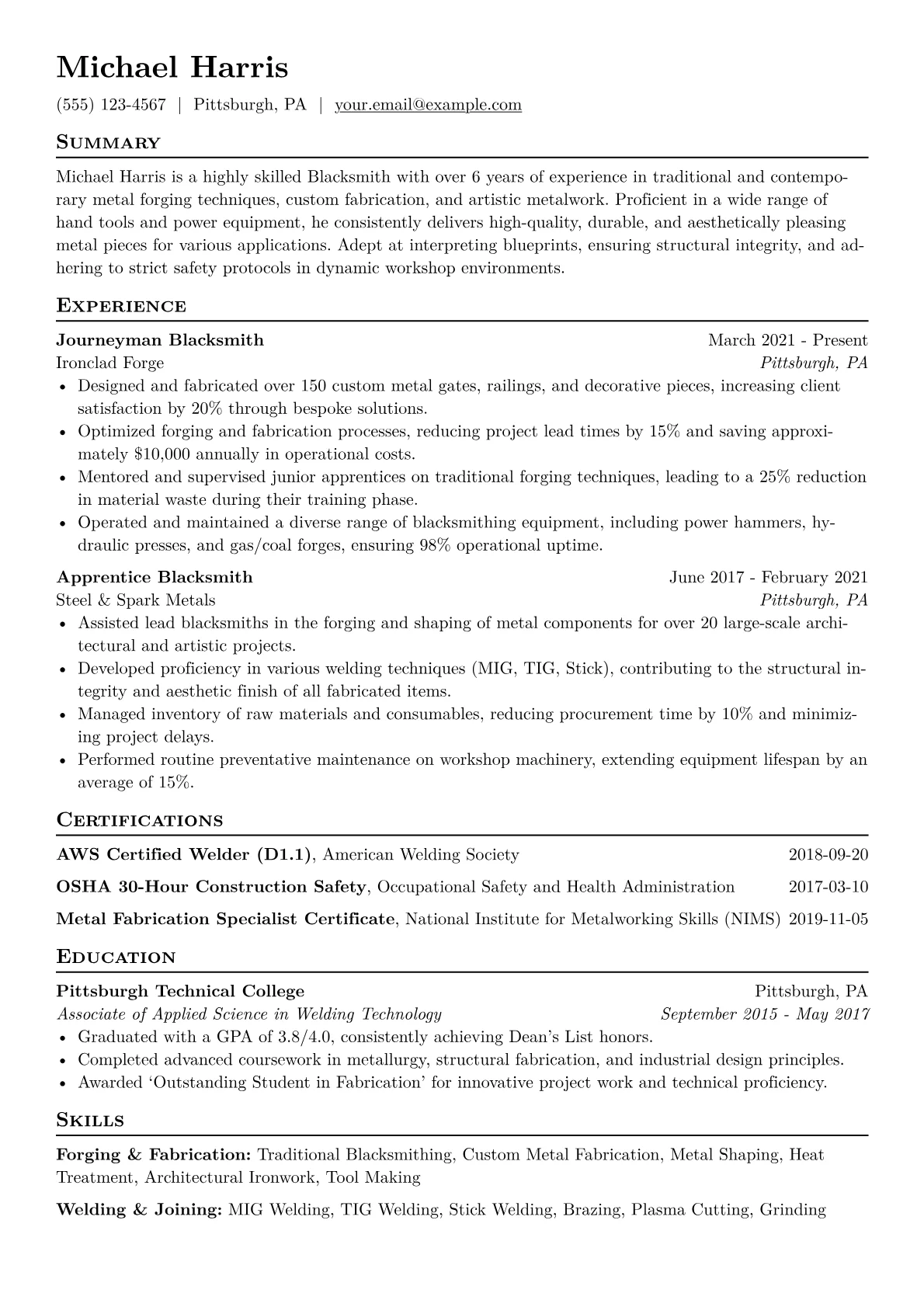 For a Blacksmith in manufacturing, a compelling resume highlights practical skill and tangible results. Hiring managers seek candidates who demonstrate proficiency in specific forging methods, such as open-die, closed-die, or upset forging, alongside a deep understanding of metallurgy for materials like carbon or alloy steels. Quantifiable achievements like meeting production quotas, reducing material waste by optimizing processes, or successfully completing complex custom fabrication projects are crucial. Certifications in related fields, such as AWS welding standards or specific safety protocols like OSHA 10/30, also provide a significant advantage.