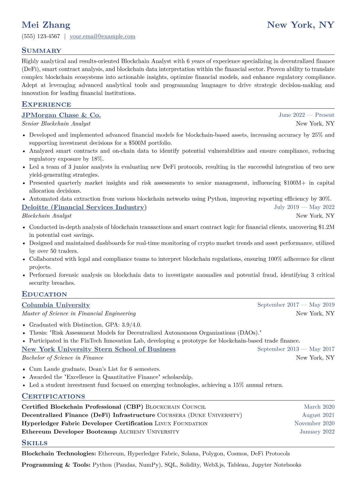 The JobSprout example effectively structures this complex profile. Achievements are robustly quantified, for instance, detailing percentage reductions in settlement times or improved data integrity. Technical skills, including specific blockchain platforms like Ethereum or Hyperledger, are clearly grouped with analytical proficiencies such as Python or SQL, providing a comprehensive view of the candidate’s capabilities. Moreover, relevant certifications and essential analytical tools are prominently highlighted, quickly communicating specialized expertise to recruiters evaluating financial technology roles.