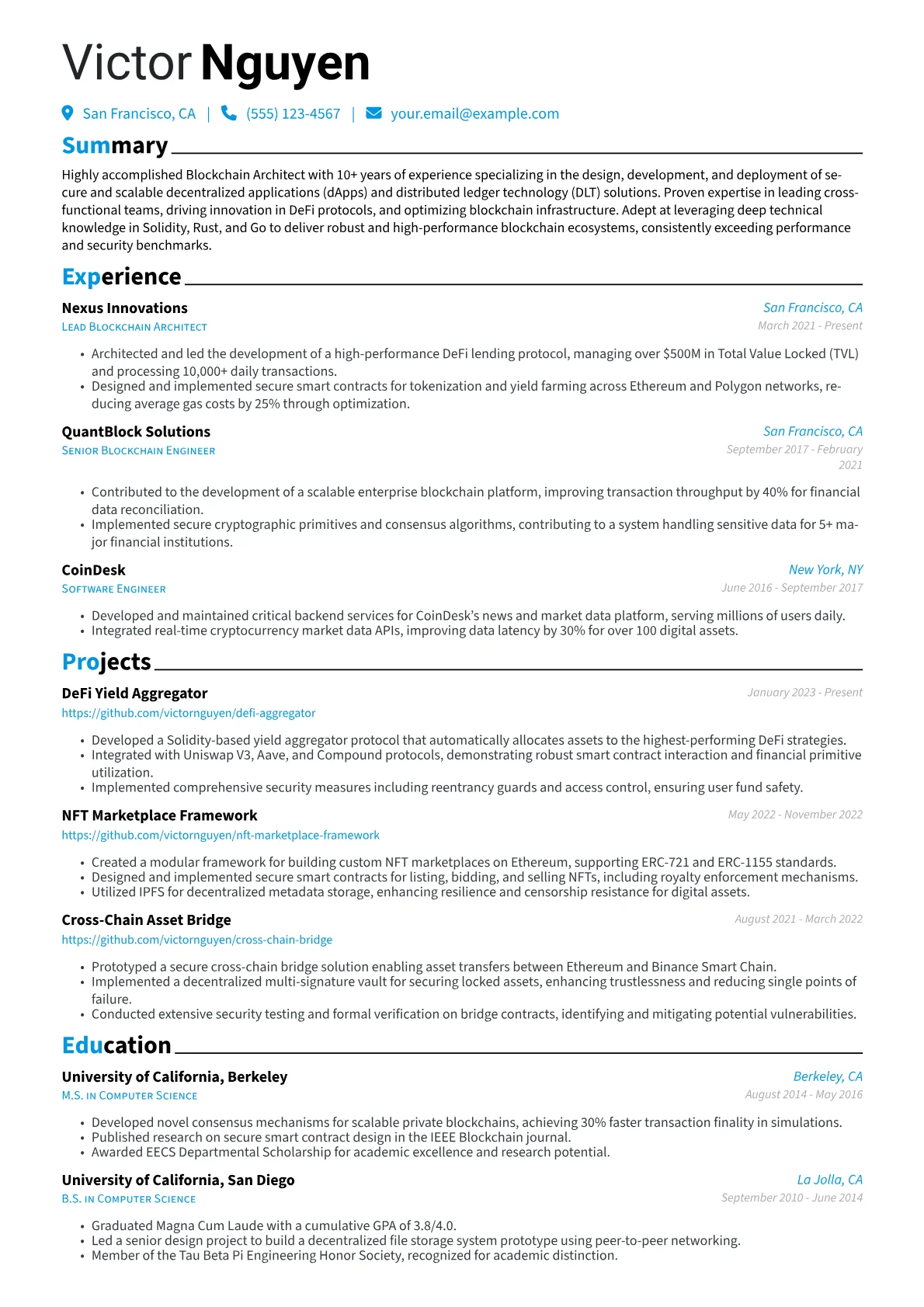 For a senior Blockchain Architect, a compelling resume must highlight deep technical leadership and strategic impact within distributed ledger technology. Hiring managers prioritize quantifiable achievements in designing and deploying complex blockchain solutions, specifically mentioning contributions to network architecture, consensus mechanism selection, and smart contract security audits. Concrete experience with Web3 frameworks, interoperability standards, and cloud integration for blockchain (e.g., AWS Managed Blockchain) is crucial, as are certifications like Certified Blockchain Solution Architect (CBSA) or specialized protocol expertise (Solidity, Rust).