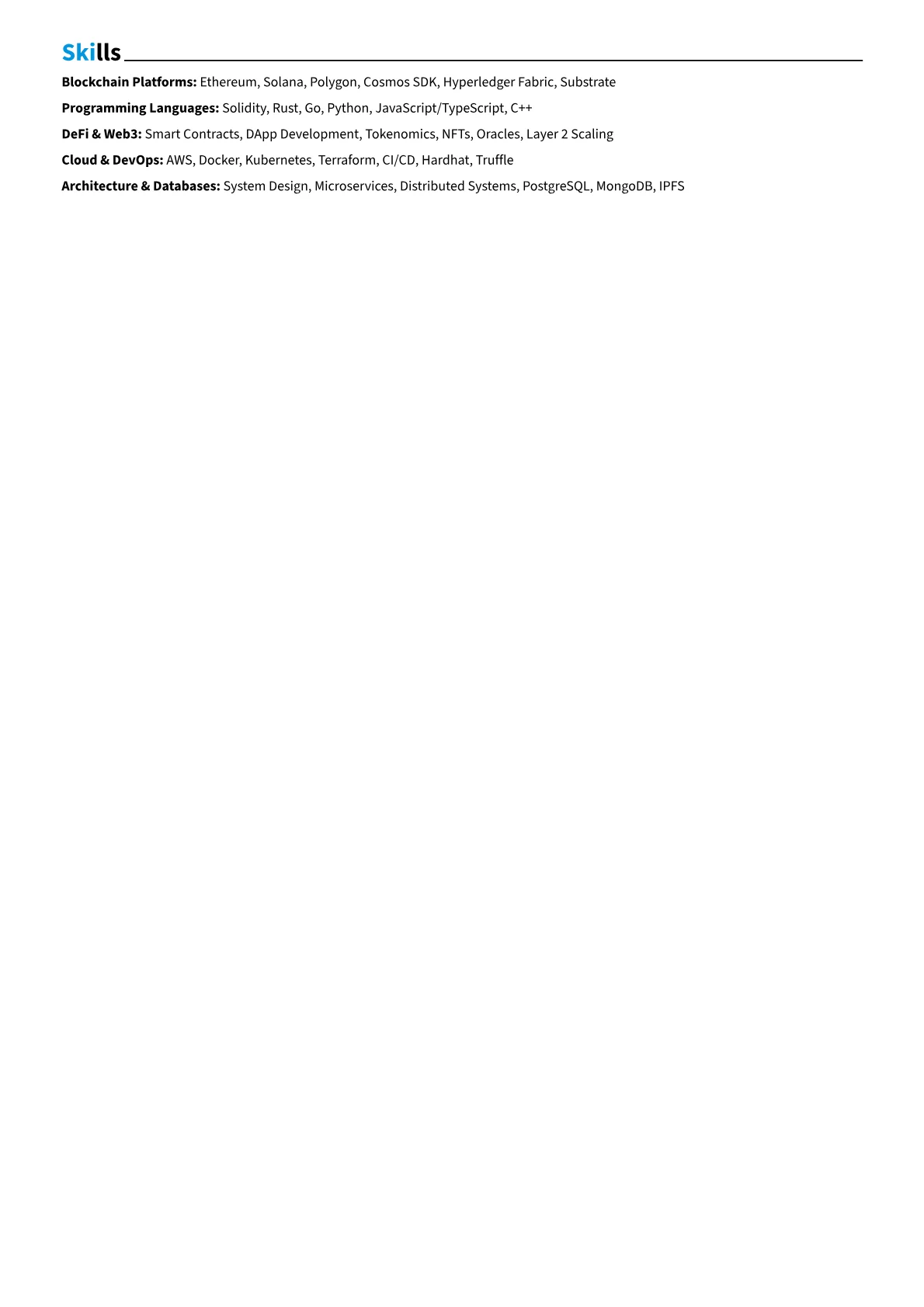 The JobSprout Blockchain Architect example effectively structures this critical information. Achievements are impact-driven, quantifying outcomes like "reduced transaction processing time by 20% through optimized smart contract design" or "secured a new client through architectural proposal of a custom permissioned blockchain." Skills are logically grouped into categories such as "Blockchain Protocols," "Cloud Platforms," and "Security," making expertise immediately discernible. Furthermore, key tools and technologies like "Ethereum, Hyperledger Fabric, IPFS" are prominently featured, demonstrating specific hands-on experience relevant to the role's demands.