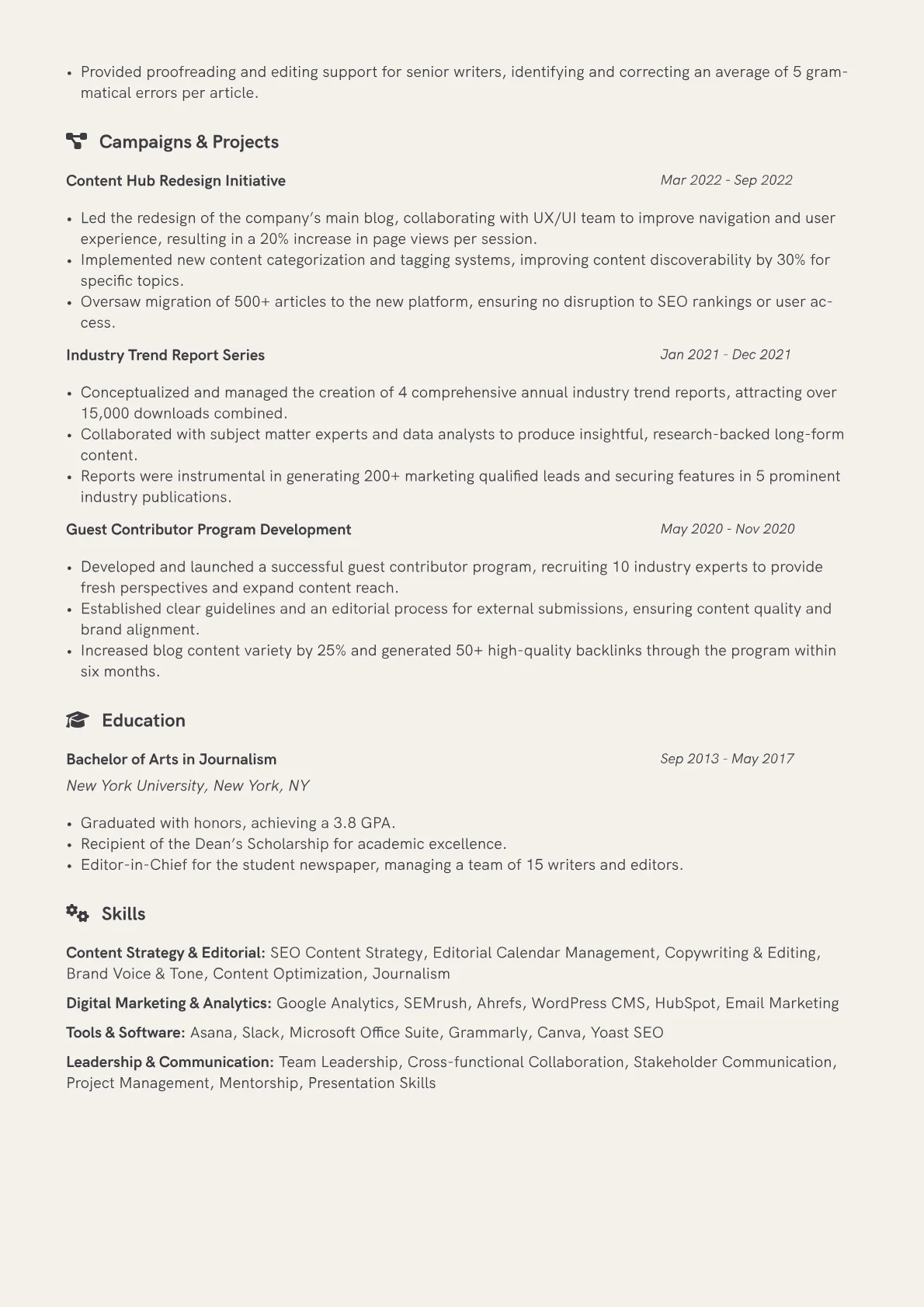 This example resume effectively highlights these vital attributes. It quantifies achievements clearly, such as "Increased blog organic traffic by 40% annually" or "Reduced content production costs by 10% through streamlined processes." Skills are intelligently grouped under categories like "Content Strategy & SEO," "Editorial Management," and "Analytics & Reporting," offering immediate clarity to recruiters. Prominently featuring proficiency with tools such as WordPress, Ahrefs, Google Analytics, and Asana quickly communicates practical readiness for the role. This structured presentation helps busy hiring teams swiftly grasp the candidate's strategic contributions and technical command.