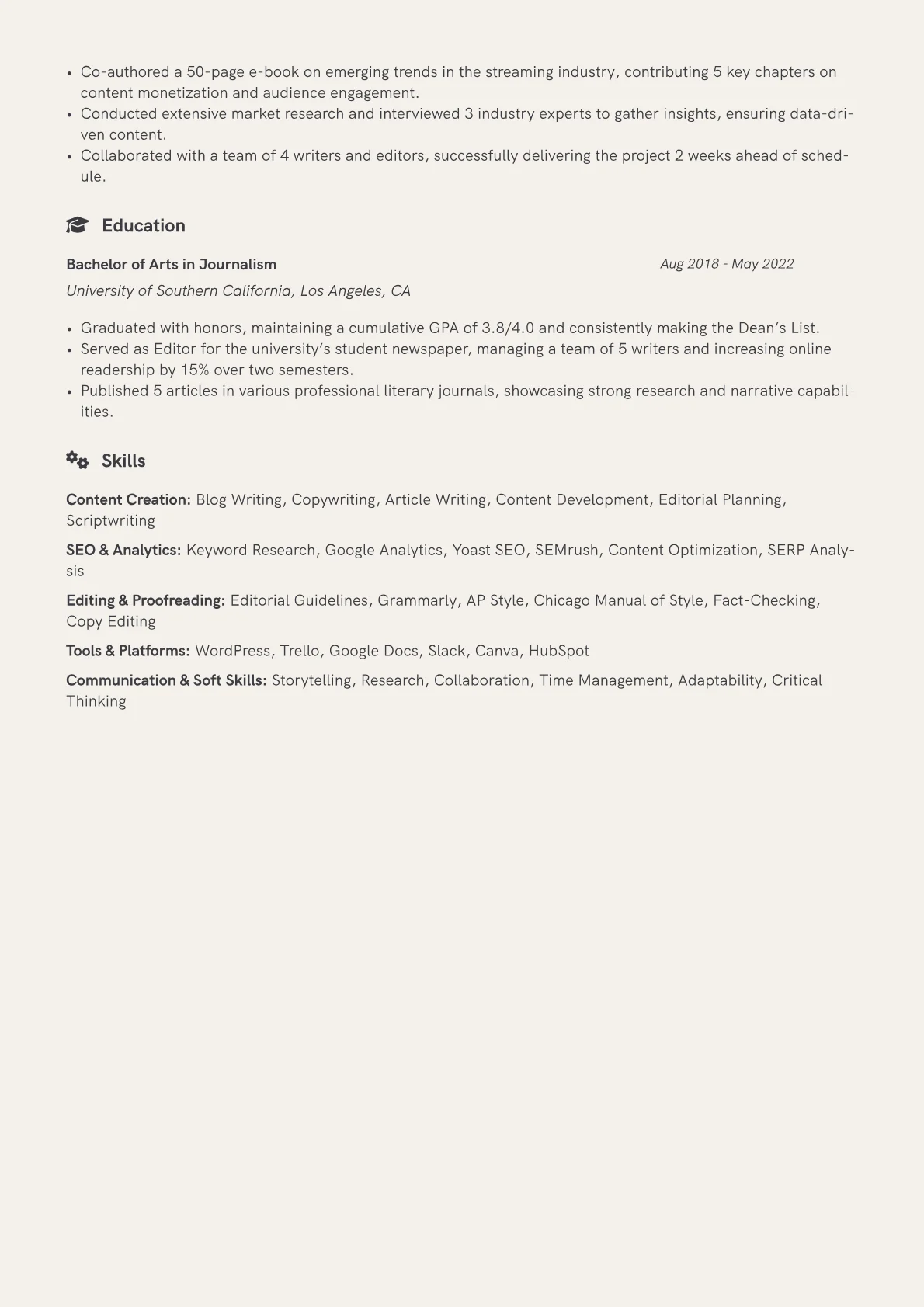 The JobSprout example resume excels by quantifying specific writing achievements, such as "published 12 articles for design blog, increasing traffic by 15%." It strategically groups skills, separating core writing abilities from essential technical tools like Figma or basic HTML, which are vital for content formatting in design-centric roles. Furthermore, it prominently features relevant certifications in content marketing or digital analytics, providing tangible evidence of a candidate's commitment to professional development. This clear, structured approach directly addresses the nuances of an entry-level role requiring both strong writing and a practical understanding of digital design ecosystems.