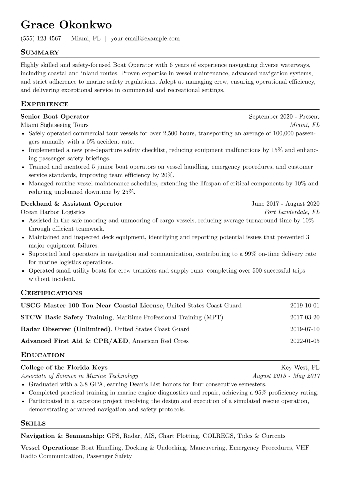 This tailored template was built using JobSprout and can be easily customized to craft your own powerful Boat Operator resume. Leverage its structure to highlight your unique experience and qualifications for your next maritime opportunity.