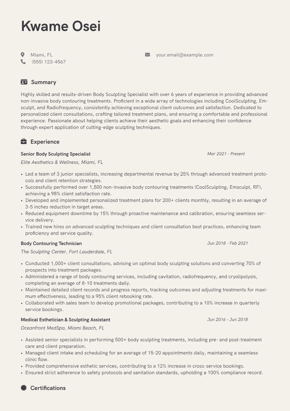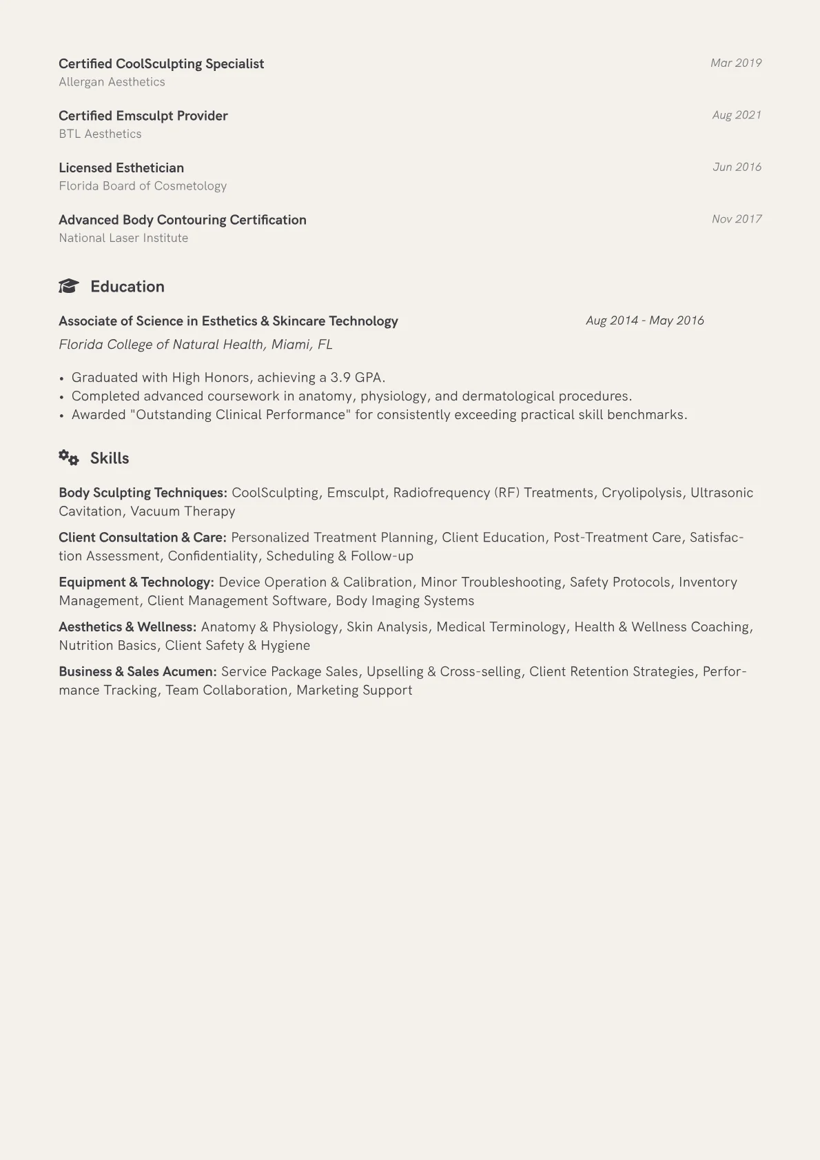 This example CV effectively showcases these elements. Its achievement section quantifies impact, for instance, by detailing a 20% increase in client retention due to tailored follow-up programs, or successful completion of over 400 procedures with high client satisfaction scores. Skills are judiciously grouped, separating "Body Contouring Technologies" like Venus Legacy operation from "Client Consultation and Education" capabilities. Certifications for advanced modalities are prominently listed under a dedicated section, underscoring specialized proficiency crucial for this field.