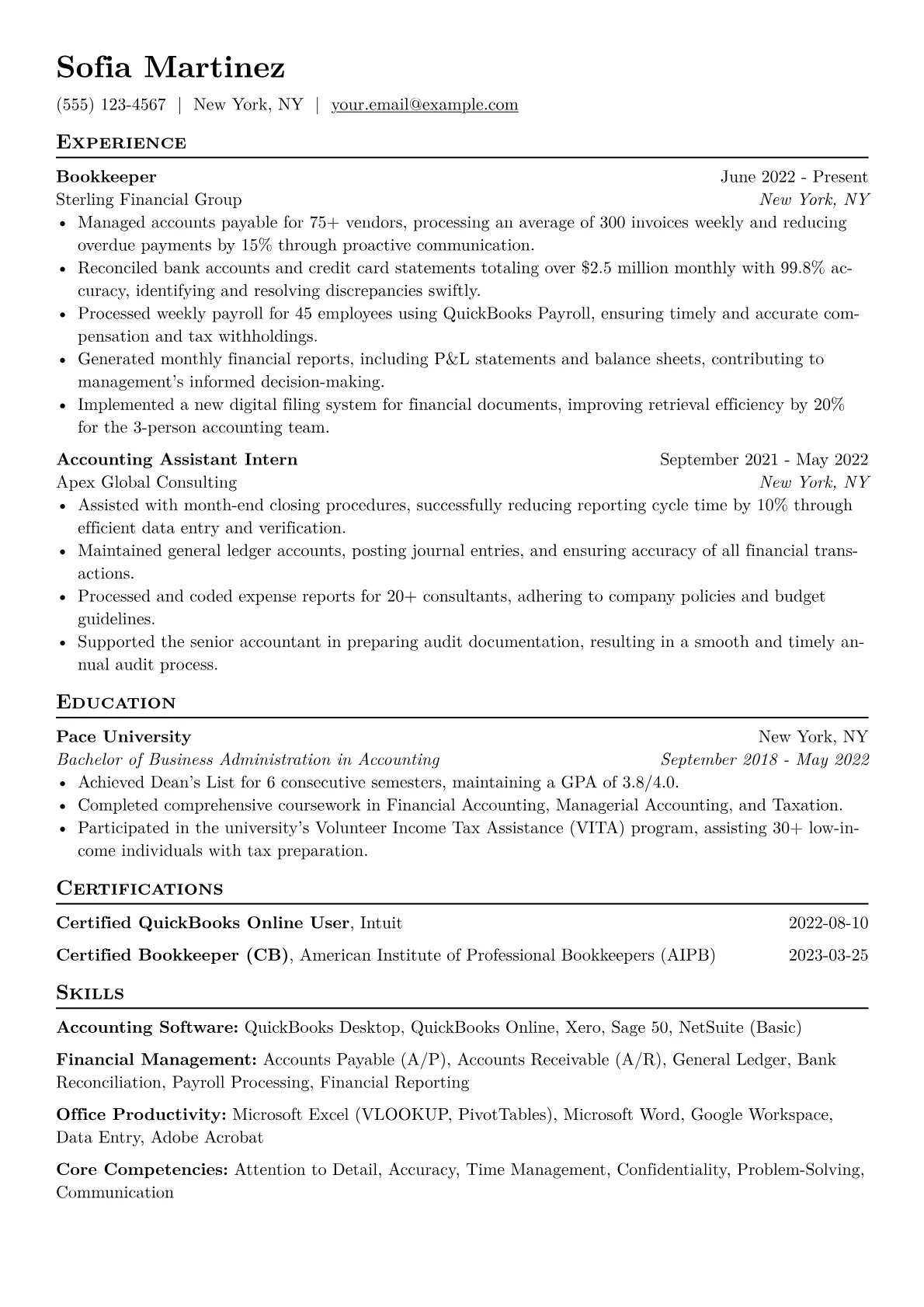 This particular Bookkeeper example excels by clearly quantifying achievements, even for entry-level experience. It effectively showcases relevant certifications like QuickBooks or Xero, signaling immediate software readiness. Skills grouping is also well-executed, categorizing technical proficiencies such as reconciliation, payroll processing, and specific accounting software, which provides hiring managers with a quick overview of capabilities.