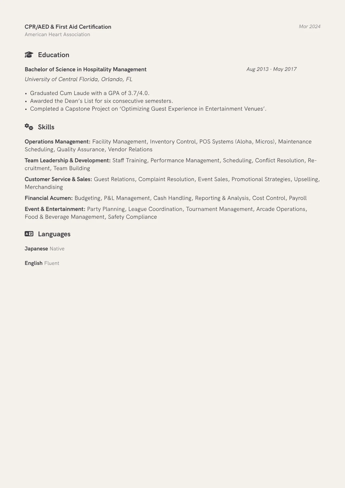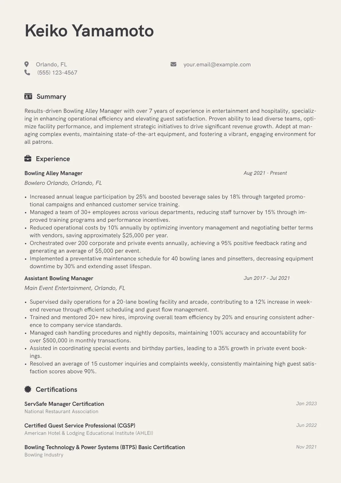 This example CV excels by quantifying achievements directly pertinent to the role, such as "increased weekend league revenue by 15% through targeted promotions" and "managed a team of 20+ staff across F&B and lane operations." Skills are grouped logically into categories like "Operational Management," "Customer Experience," and "Technical Proficiency," clearly highlighting capabilities like pinsetter maintenance and inventory control. Crucial certifications, including a food handler's permit or specific lane system training, are prominently featured, demonstrating a comprehensive grasp of industry standards and safety.