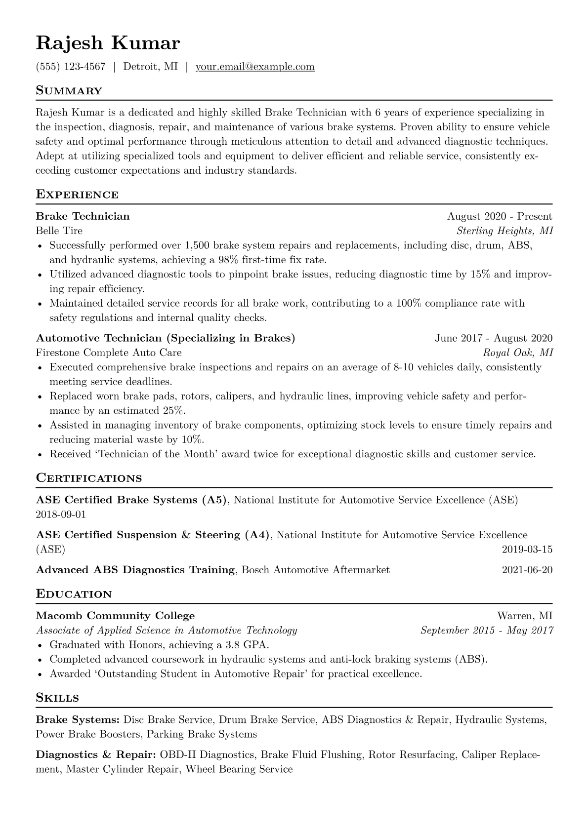 This template was built with JobSprout and can be remixed to create your own tailored Brake Technician resume, effectively presenting your unique qualifications.