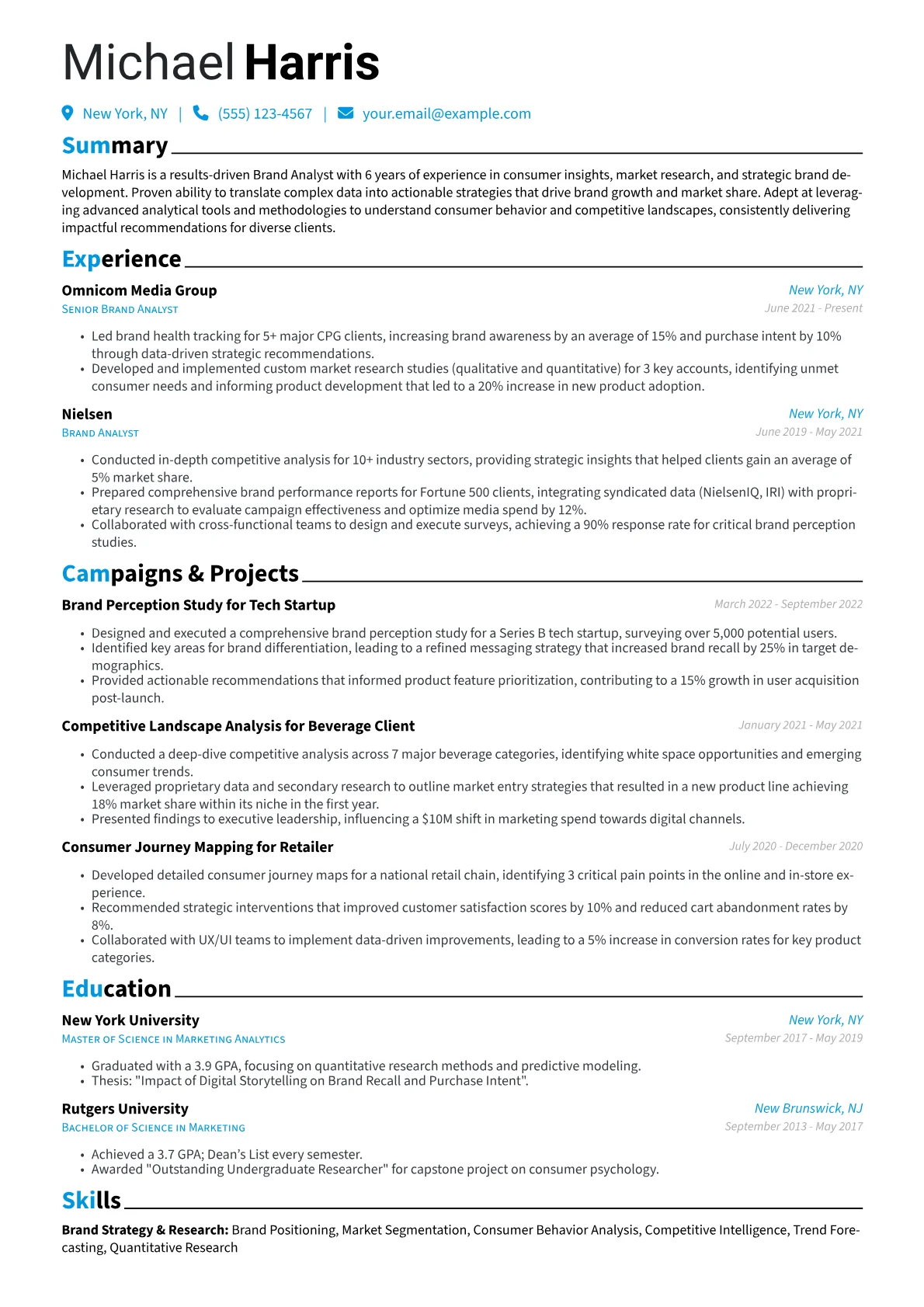 A compelling Brand Analyst resume in Marketing & Advertising highlights an individual's analytical prowess and strategic impact. Hiring managers seek evidence of translating complex market research and consumer insights into actionable brand strategies. Concrete achievements include improving brand perception scores, identifying new growth segments, or increasing brand equity by specific percentages. Mastery of tools like Google Analytics, Adobe Analytics, and experience with syndicated data providers such as Nielsen or Kantar are crucial. The resume should feature terminology like competitor analysis, brand positioning, and ROI analysis, demonstrating a deep understanding of brand health and strategic recommendations.