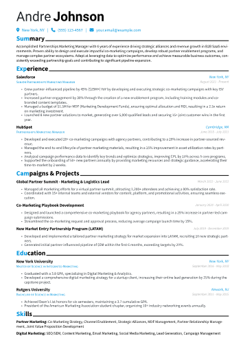 This Brand Analyst example expertly showcases these critical elements. Achievements are consistently quantified, such as "optimized content strategy, boosting brand engagement by 18%." The skills section is logically organized, separating analytical tools like Tableau and Qualtrics from core marketing competencies such as brand architecture and campaign performance evaluation. Certifications, like a Google Analytics Advanced certification, are prominently placed, validating technical expertise. This structure ensures a hiring manager can quickly grasp the candidate's specific contributions to brand health and strategic growth.