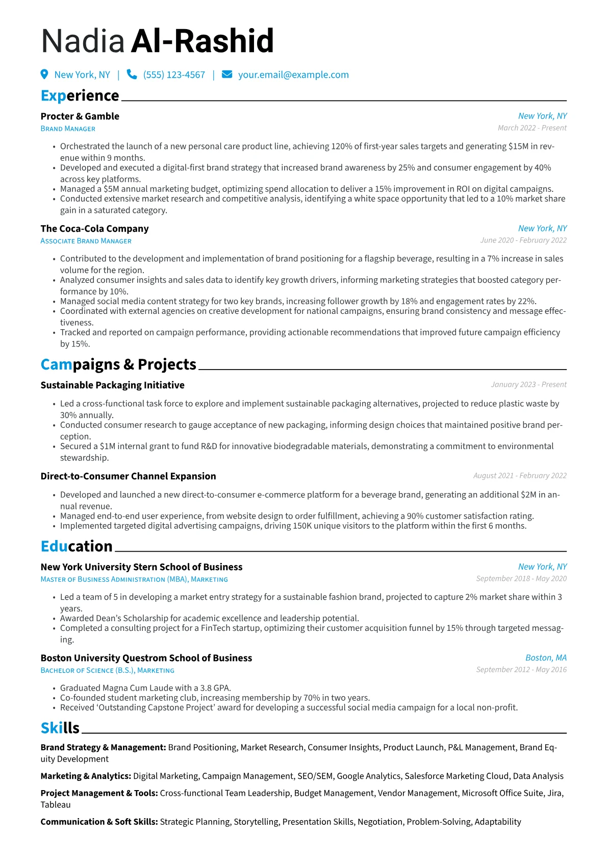 A strong Brand Manager resume in Marketing & Advertising immediately highlights strategic impact and measurable results. Hiring managers seek candidates who demonstrate proven success in brand growth, market share expansion, and effective campaign leadership driven by consumer insights. The unique challenge is clearly quantifying ROI and engagement within a dynamic, creative field.