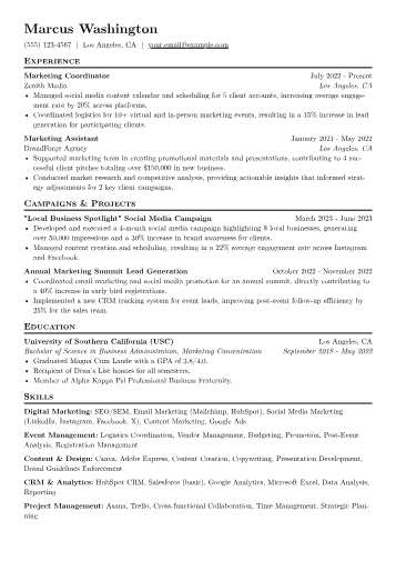 This JobSprout example excels by prominently featuring quantified achievements, clearly illustrating campaign success and brand uplift with specific metrics. Its strategic skills grouping effectively showcases both analytical prowess and creative marketing competencies crucial for this mid-level role. The inclusion of relevant industry certifications further validates specialized expertise and professional commitment.