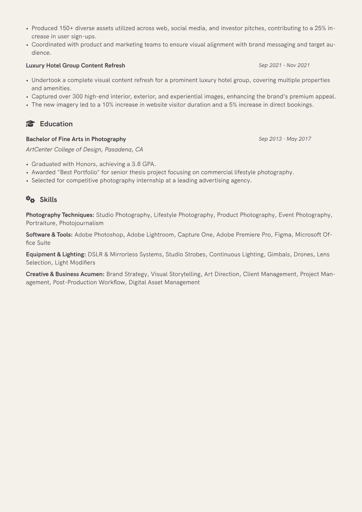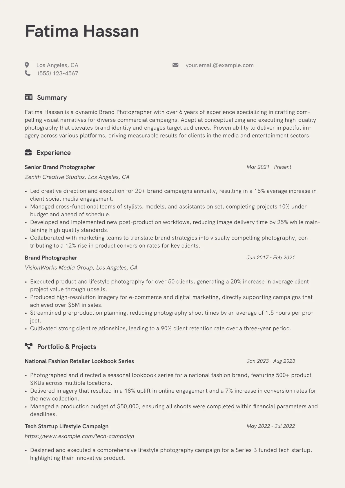 This example CV effectively highlights a Brand Photographer's distinct value proposition. Achievements are quantified, demonstrating direct impact, such as "orchestrated visual content that increased social media reach by 25% for a major film release." Skills are logically grouped into categories like "Photography & Post-Production Software" and "Art Direction & Concept Development," making technical and creative capabilities immediately clear. The resume prominently features a link to an online portfolio, allowing hiring managers immediate access to visual work. Furthermore, specific camera systems, lighting techniques, and digital asset management experience are explicitly detailed, underscoring practical expertise.