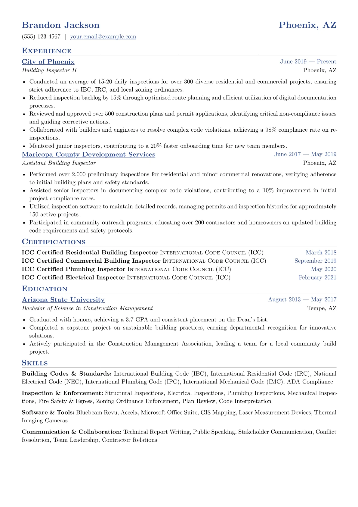 This template was expertly crafted using JobSprout and can be easily customized to build your own compelling building inspector resume.